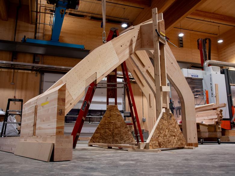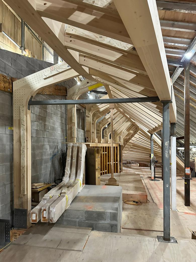 Due to the tight site constraints, mass timber elements needed to be prefabricated off-site. Our designers worked collaboratively with skilled craftspeople in Canada at a facility that specializes in design for manufacture and assembly (DFMA). Over 2,700 highly unique timber elements were created for this project before being transported to the site. As a testament to the precision of both the design and fabrication, not a single element required adjustment during the installation process.