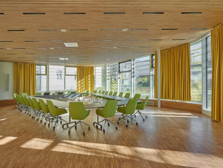 The new town hall with its redesigned square and the familiar old town hall building open the way confidently into the new town center. As befits an important public building, the town hall is set apart by dint of its size and location, but it is also part of an ensemble that has a clear relationship with the neighboring buildings. The first story houses services for citizens: it is divided into two independent sections with a free-form design characterized by a sense of transparency. Set in the middle of a large space designated for public use, the two ground-level sections also emphasize the theme of open access from the town hall square to the green areas to the west. On the one side, there is the busy citizens’ service office, including the foyer and an open staircase leading to the upper story. On the other side, there is the council chamber and the room for wedding ceremonies.