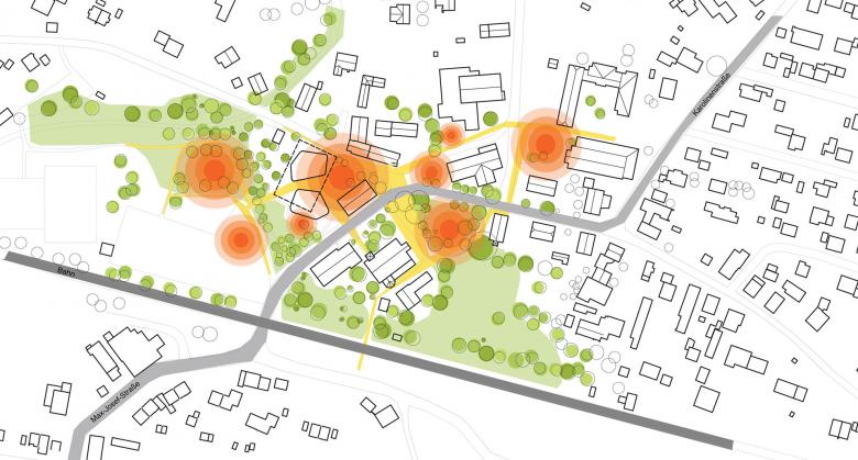 Großkarolinenfeld, to the north of the city of Rosenheim, had previously lacked a clearly defined center. A network of newly designed green areas, public squares, and pathways creates an effectively integrated urban space. The new town hall square is situated between the old and the new town hall buildings, with a route through the open space leading to the green spaces around the Erlbach stream to the southwest. This public path through the building connects the square via a pedestrian bridge with the playground and public festivals area. The adjacent town hall gardens include generous stepped seating for rest and relaxation.