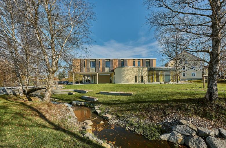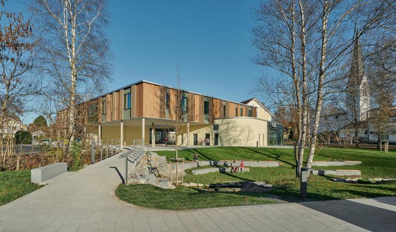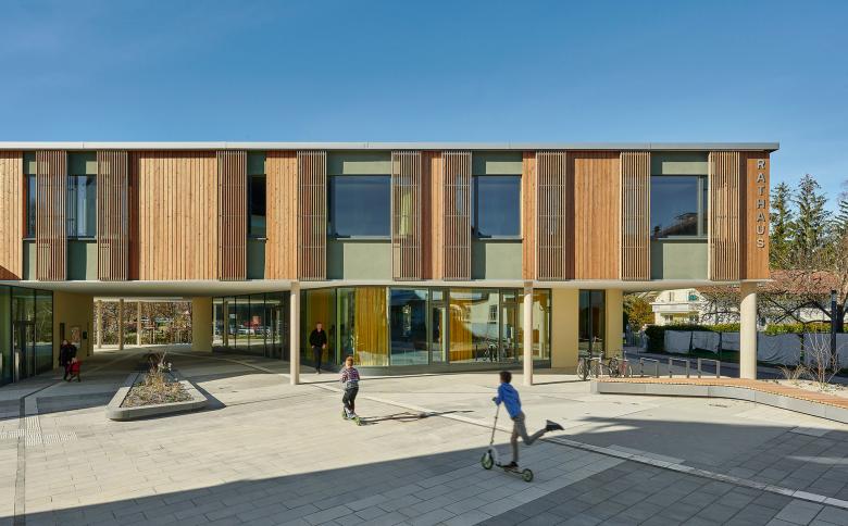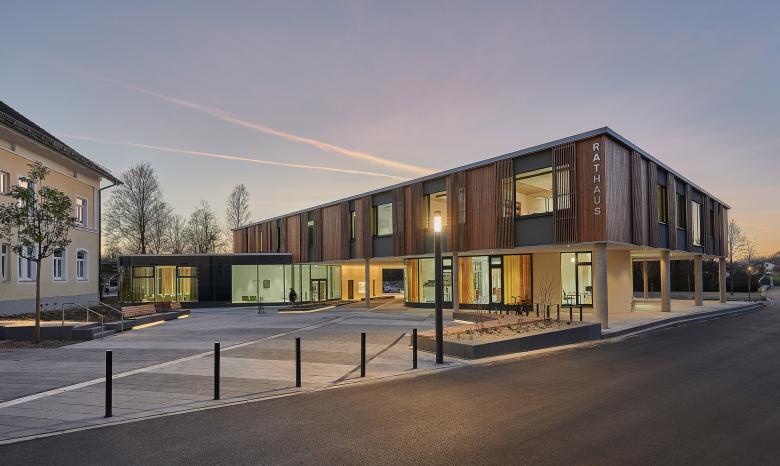 The distinctive appearance of the new town hall adds a modern and assured touch to the small Bavarian town of Großkarolinenfeld. The outdoor areas adjacent to the building have also been refurbished and enhanced, making for a new focal point in the center of the town. Various public green spaces and recreational areas, new pathways, and provisions for seating offer local residents attractive opportunities for meeting and undertaking activities together.