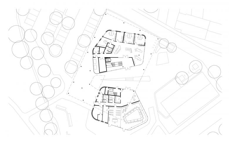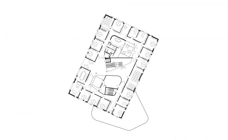 The upper story stands above the two parts of the first floor as a regular oblong block. This houses the less public offices of the municipal administration. The management, construction, and finance departments, which are each grouped around a corner of the block along the exterior facade, are ranged around two atriums in the interior. One of these extends down into the first story, penetrating the building with daylight, while the other is restricted to the upper story and creates an internal space.
