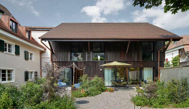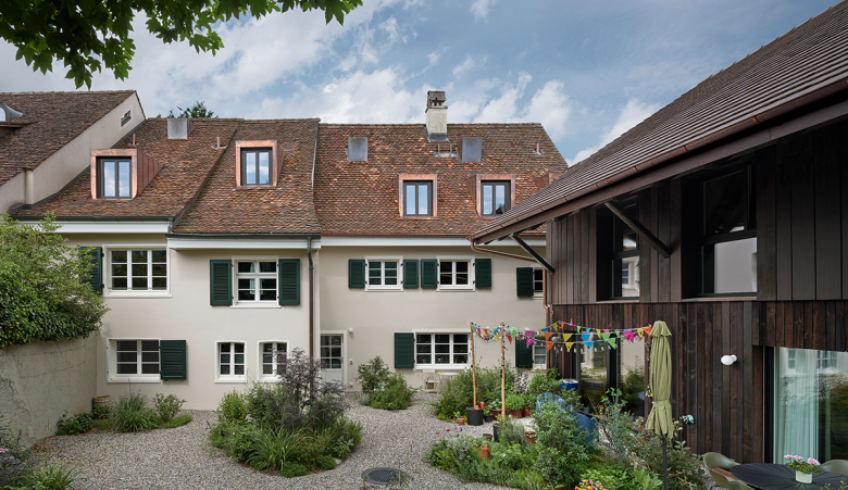 Der Hinterhof wurde so konzipiert, dass alle Bewohner über einen eigenen Sitzplatz verfügen, gleichzeitig aber auch eine gemeinschaftlich nutzbare Fläche für Feste und Begegnungen entsteht. Die Bepflanzung besteht aus einheimischen, standortgerechten Arten – sowohl im Hof wie auch auf der dem Strassenraum zugewandten Seite. Im hinteren Bereich der länglichen Parzelle stehen zusätzliche Gartenpflanzplätze zur Verfügung.