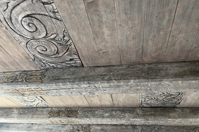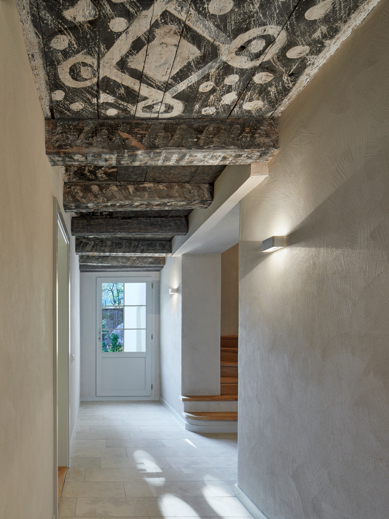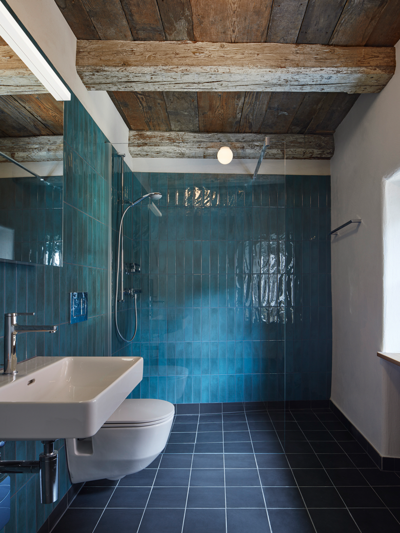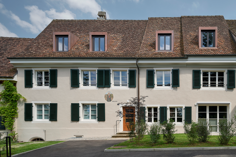 Auch die Fassaden wurden überarbeitet: fehlende Fensterläden wurden in der typischen tannengrünen Farbgebung ergänzt, die bestehenden Oberflächen aufgefrischt. Durch den behutsamen Umgang mit der historischen Substanz und die Wiederaufnahme der ursprünglichen Farbigkeit fügt sich das Ensemble heute wieder selbstverständlich in das Dorfbild ein.