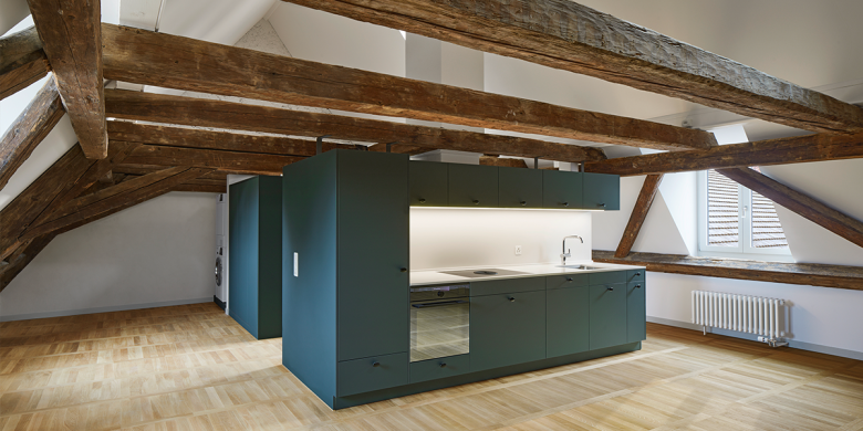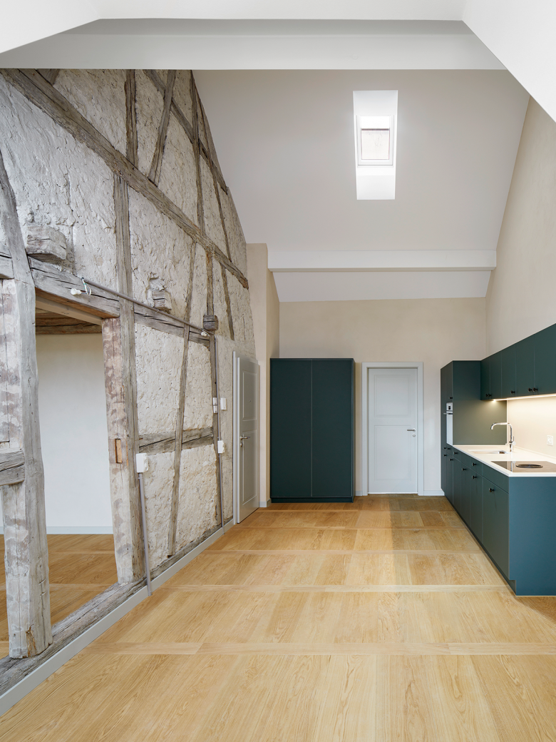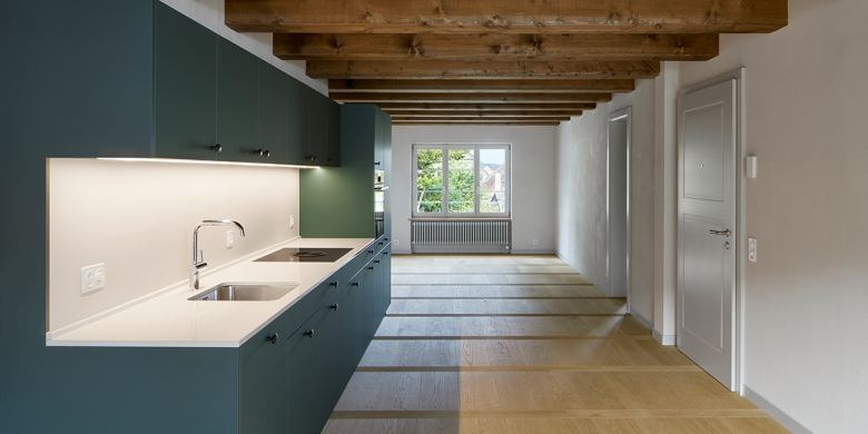 Nach dem Umbau beherbergen die Gebäude nun sechs Eineinhalb-Zimmer-Wohnungen sowie zwei Einfamilienhäuser. Besonders die ehemalige, als Lager genutzte Scheune konnte erfolgreich in ein Einfamilienhaus umgenutzt werden. Der rückseitige Teil der Blockrandbebauung erhielt seinen ursprünglichen Bauernhauscharakter zurück. In diesem Zusammenhang wurden Küchen und Bäder bewusst einfach und funktional gestaltet. Die grosszügigen Wohnküchen bilden das Zentrum der Wohnungen, an die die Wohnräume direkt anschliessen. Insgesamt konnte die effektive Wohnfläche um über fünfzig Prozent erhöht werden.