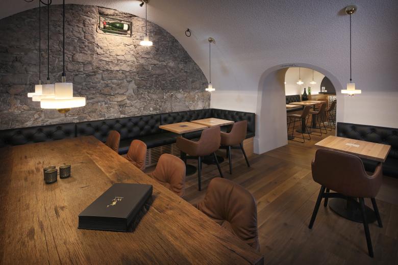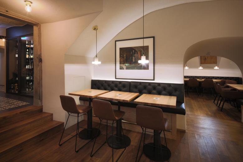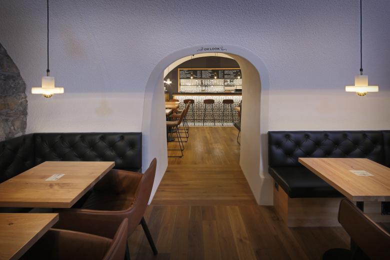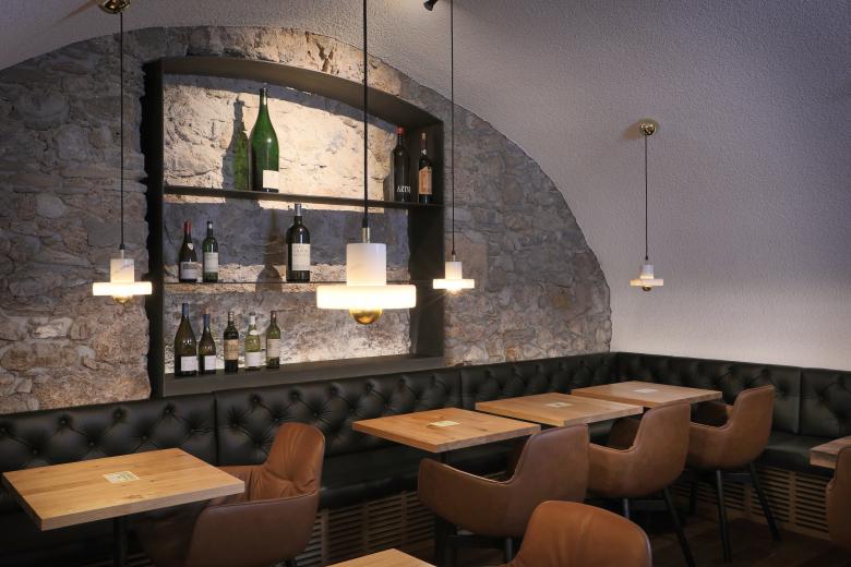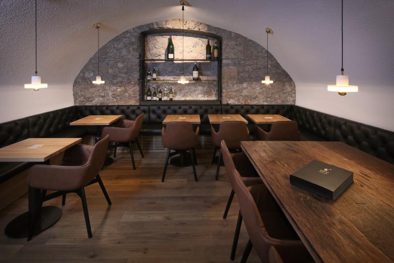 Eine Sitzbank umrahmt beide Räume, die mit mehreren kleinen Tischen bestückt sind. Dies lässt eine flexible Raumbesetzung zu. Zentraler Punkt ist die Bar aus Räuchereiche mit Messing- und Lederverkleidungen. Indirektes Licht soll die Gewölbe noch zusätzlich inszenieren und für eine gewisse Grundhelligkeit in den eher dunklen Kellerräumen sorgen.