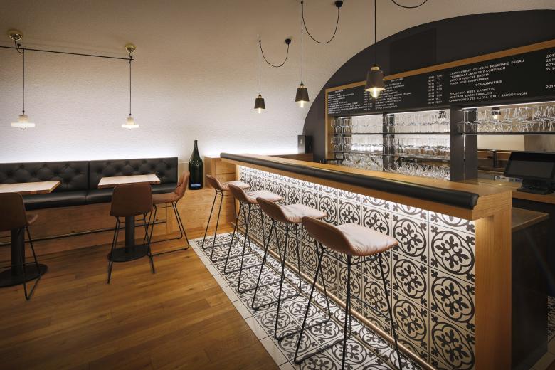 Die historischen Gewölbe im Keller geben den Räumen eine spezielle Atmosphäre welche gut in das Thema Weinbar passt. Auf den insgesamt 122 Quadratmeter befinden sich, neben einem Eingangsbereich und einer Küche, eine Bar mit zwei Aufenthaltsräumen für Gäste. Ein Zementfliesenboden zieht sich durch den kompletten Eingangsbereich um dann mit einem radikalen Wechsel zu Parkett den Wechsel zum Barbereich zu unterstreichen. Die Möblierung wird von dunklen Farben, Leder und Holz dominiert.
