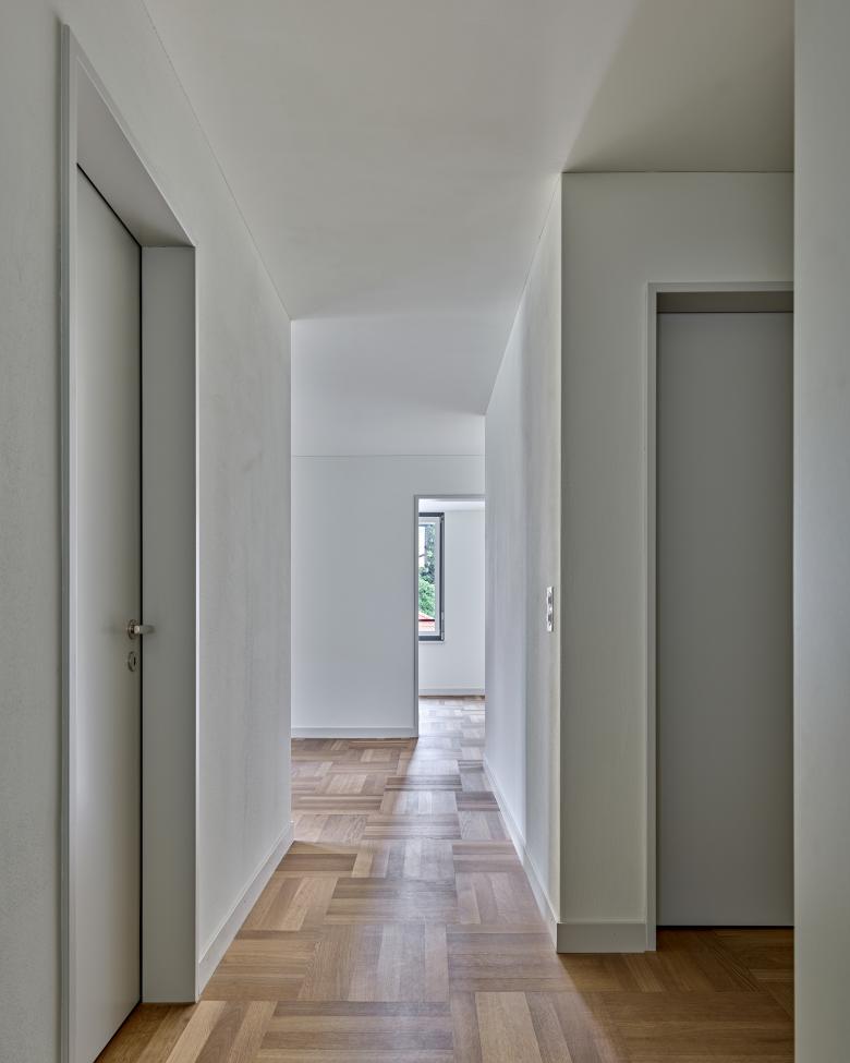 Alle Wohnungen werden über ein grosszügiges Entrée mit Garderobe betreten. Der Wohn-Essraum ist zumeist als zonierte Raumfigur konzipiert. Von der ostseitigen Strassenfassade mit den Koch- und Essbereichen in Richtung Morgensonne, reicht der fliessende Raum bis an die westseitige Fassade mit dem Wohnbereich. Beide Ausrichtungen erhalten einen Aussenraum: eine eingezogene Loggia nach Westen gewährleistet einen hohen Grad an Privatheit, wohingegen ein kleiner auskragender Balkon den Strassenraum belebt und aktiviert und eine attraktive Sicht über die Stadt und ins Quartier bietet.