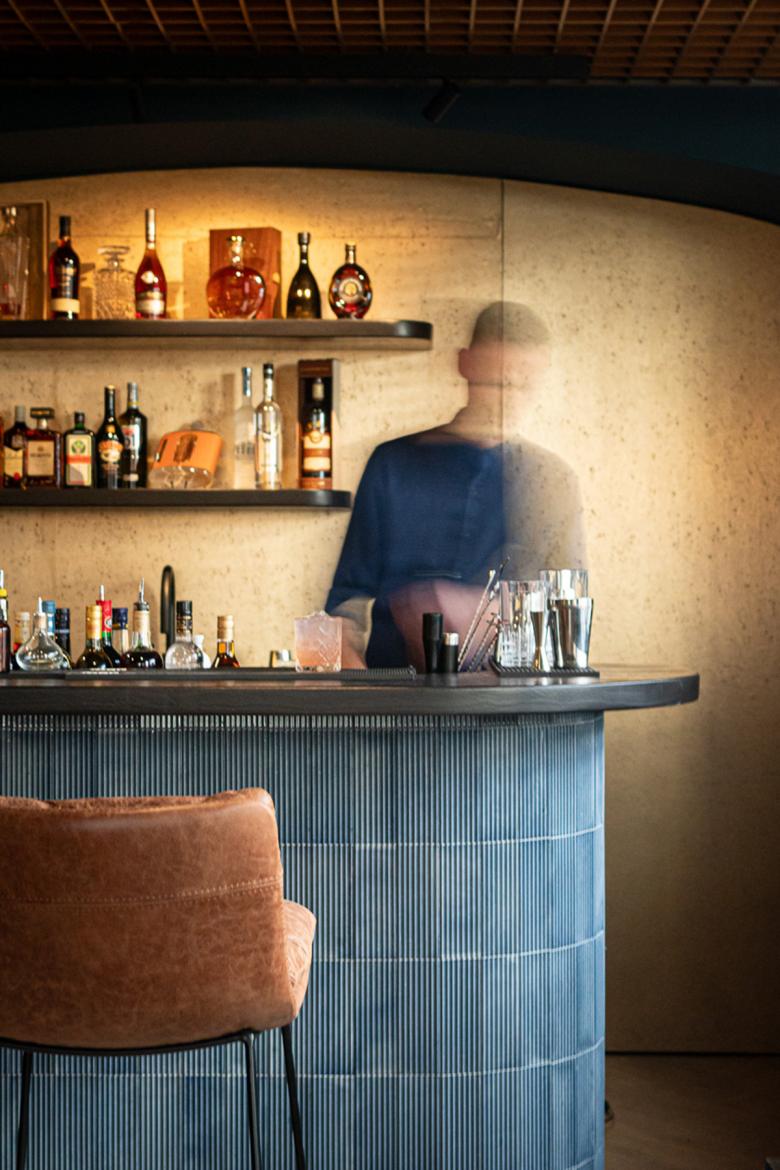 Die Formensprache ist bewusst weich und organisch gewählt, während eine reduzierte Materialpalette aus Holz, Textilien und warmem Licht eine einladende Atmosphäre erzeugt. Zonierungen aus transluzenten Elementen schaffen intime Räume, ohne die Offenheit des Gesamtkonzepts zu verlieren.