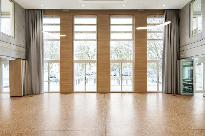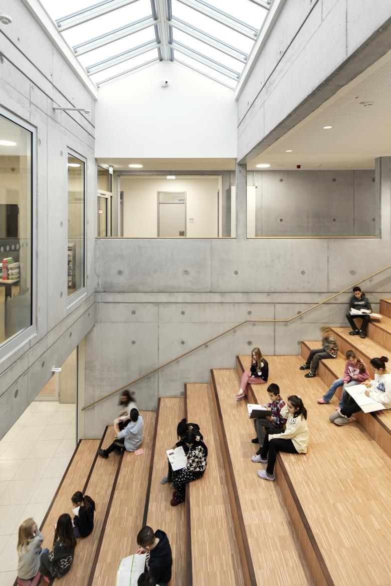 Zentrales Element ist das zweigeschossige Forum als multifunktionale Fläche im Erdgeschoss. Speiseraum und Musikraum sind durch mobile Trennwände zuschaltbar, so dass sich vielfältige Möglichkeiten der Bespielung ergeben. Eine großzügige Lerntreppe bindet das Obergeschoss an. Zwei eingestellte Kernbereiche nehmen die Nebenräume auf.