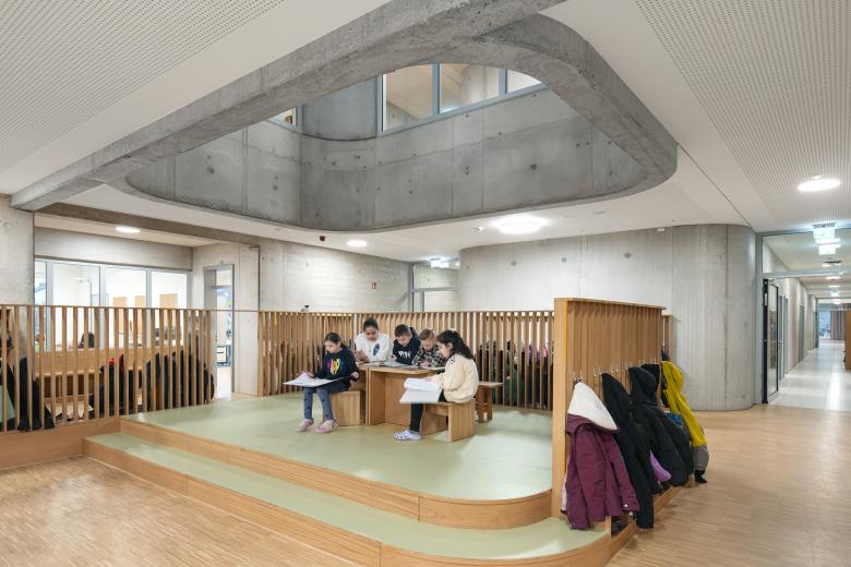 Im Innern ist die Grundschule klar gegliedert. Die Unterrichtsbereiche mit den differenzierten Lernflächen sind im westlichen Gebäudeteil organisiert und gruppieren sich um die freie Lernfläche. Der östliche, breitere Teil beinhaltet die gemeinsamen Lernflächen und die Verwaltung.
