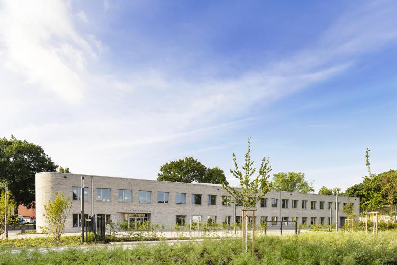 Der Baukörper ist geprägt von seiner kompakten Form mit den gerundeten Gebäudeecken und Eingängen. Ein heller, sandfarbener Ziegel sowie einheitliche quadratische Fensterformate unterstreichen den modernen und zeitgemäßen Charakter des Schulgebäudes. Das Forum öffnet sich großzügig zur öffentlichen Seite.