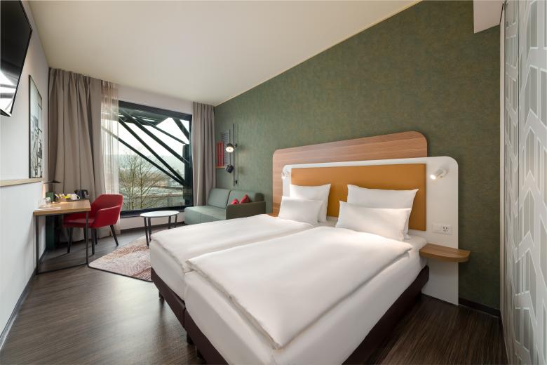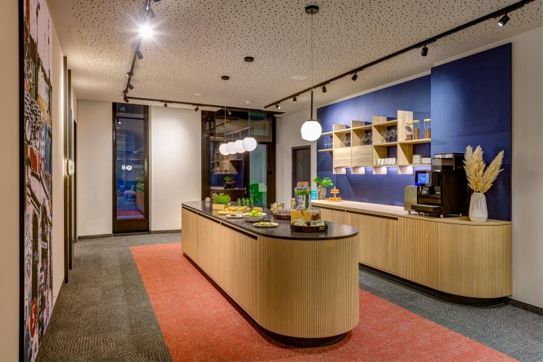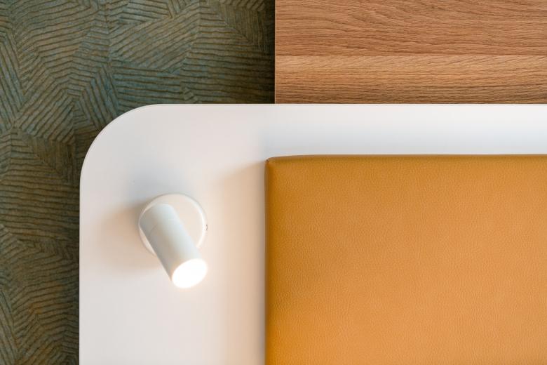 Im Rahmen der Umsetzung des Design-Konzepts hat BRUMANN in zahlreichen Bereichen auf eine Wiederverwendung von Bestand gesetzt. Durch die gekonnte Kombination neuer Materialien, modifizierter Bestandsmöbel und ästhetischer Anpassungen ist es gelungen, ein ansprechendes, nachhaltiges und ressourcenschonendes Gesamtkonzept zu realisieren. So wurde beispielsweise das Bettkopfteil erhalten und ansprechend umgestaltet; Teile der Materialien dienten zudem als Inspirationsquelle für die Farbgestaltung der Wände. Kleine Veränderungen wie eine neue Platte für das Gestell des Schreibtisches, eine neue Grafik im Badbereich oder eine Verkleidung der Rückwand im Schrank setzen zusätzliche ästhetische Akzente. In den öffentlichen Bereichen wurde das Upcycling fortgesetzt. Die Bar wurde neu verkleidet und erzeugt mit dem neuen, offenen Flaschenregal eine neue Dynamik im Raum, das sich auch in dem gelungenen Mix aus Bestand- und neuen Möbel fortsetzt. Die Kaffeestation wurde zudem renoviert und ist nun schließbar; im Restaurantbereich wurde ein Raumtrennelement in einen Kamin umgewandelt. Ein nachhaltiger Ansatz, der ressourcenschonend den Gästen ein modernes und einladendes Ambiente bietet.