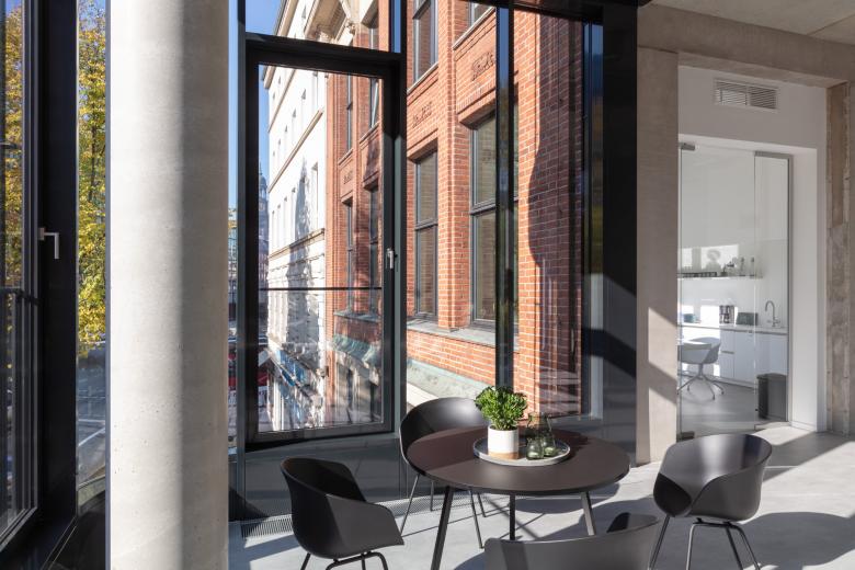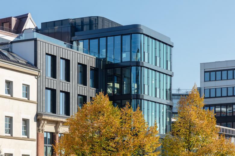 Unser Ziel war es, die drei auf engstem Raum stehenden Gebäudeteile Altbau, Aufstockung und Neubau in dem Rahmen, den die Denkmalpflege und die Statik des Bestands vorgaben, zu einem harmonischen, aber spannungsreichem Gesamtbild zusammenzufügen. Das Dach des Bestandsgebäudes wurde bis zum Gesims zurückgebaut und erhielt eine zweigeschossige, mit dunklen Metallpaneelen verkleidete Aufstockung in der Flucht der darunter liegenden Fassade. Auch die großformatigen neuen Fensteröffnungen liegen in den Achsen des Bestands.