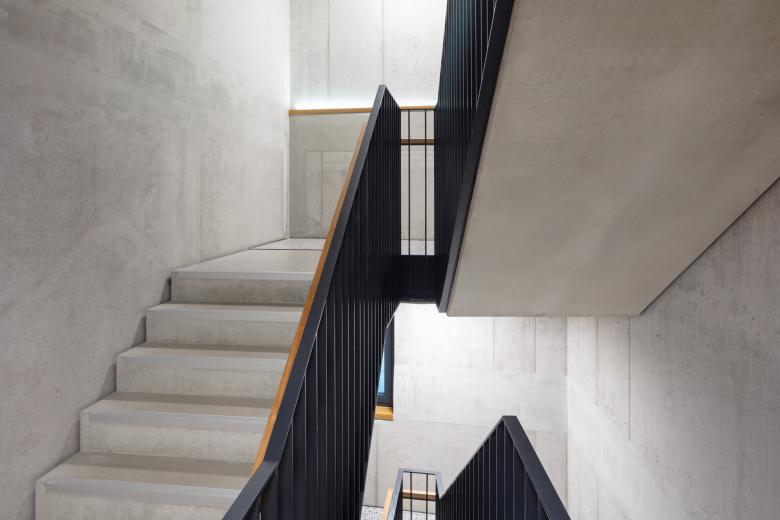 Auf dem Dach befindet sich nun eine Dachterrasse, die aus dem obersten Geschoss des angrenzenden Neubaus erschlossen wird. Dieser sechsgeschossige Baukörper liegt an einer schmalen Öffnung des Blockrands. Diese herausgestellte Position betonen wir mit nach vorne auskragenden Obergeschossen und einer kleinen Arkade im Erdgeschoss. Die schmuckreiche Ansicht des Altbaus kontrastieren wir mit einer coolen, dynamisch um die gerundeten Gebäudeecken geführten Glasfassade.