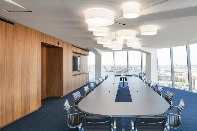 Eine der sich stolz im Düsseldorfer Medienhafen präsentierenden Landmarken ist das Bürohochhaus SIGN! von Murphy/Jahn. Seit der Eröffnung ist dies die repräsentative Adresse der Wirtschaftskanzlei Noerr. 2015 mietete das expandierende Unternehmen weitere Etagen hinzu, darunter auch das beeindruckende Skydeck in der 19. Etage, und beauftragte uns mit dem Interior Design. Die Kanzlei wünschte sich eine ganzheitliche, moderne und hochwertige Gestaltung sowohl für die Büroetagen auch als für die Konferenz- und Veranstaltungsbereiche. Mit edlen natürlichen Materialien wie Teakholz und Kalkstein und sorgsam ausgewogenen organischen Formen haben wir ein ebenso wohnliches wie hochprofessionelles Ambiente geschaffen, das einen wohltuenden Kontrast zur coolen High-Tech-Architektur darstellt. Bei den ICONIC AWARDS 2017 und den German Design Award 2018 wurde das Noerr-Interior als „Winner“ ausgezeichnet.