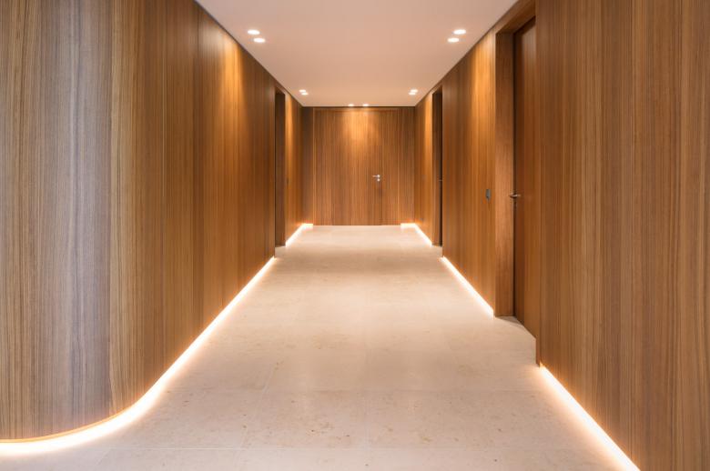 Die von Noerr neu angemieteten Etagen haben wir mit einem hohen gestalterischen Anspruch als klassische Bürobereiche ausgebaut. Hochschallisolierte Einzelbüros bieten maximale Diskretion, den Raum öffnen wir mit großzügig verglasten Teeküchen und Pausenbereichen, die zum informellen Austausch einladen. Panoramaaufzüge erschließen das 17. Obergeschoss mit den Besprechungsräumen. Der großzügige Empfangsbereich ist offen gestaltet, sodass das Panorama von Stadt und Hafen mit seinen sich kontinuierlich mit Tageszeit und Wetter wandelnden Bewegtbildern Teil der räumlichen Inszenierung wird. Sämtliche Innenwände, Zargen und Türen sind mit Teakholz verkleidet, in das warme Farbspektrum fügt sich der gesandstrahlte und gebürstete Boden aus hellem Jura Rahmweiß harmonisch ein. Für die sechs Meter lange L-förmige Empfangstheke haben wir beide Materialien in einem Element vereint. Steinmetze und Schreiner haben hier mit größter Präzision erst im eigenen Betrieb, dann Hand in Hand vor Ort zusammengearbeitet, um dieses außergewöhnliche und wertige Objekt zu realisieren.