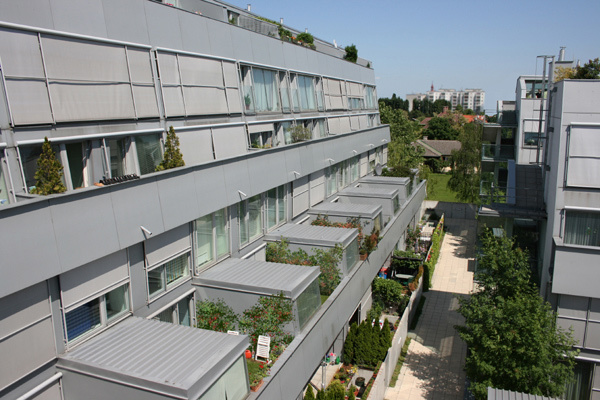 Trotz relativer Dichte ist der Geschosswohnbau so gestaltet, dass jede Wohnung abgeschirmte, bepflanzbare Freiräume und optimierte Besonnungs- und Sichtverhältnisse hat. Dazu haben die Architekten den Querschnitt der Trakte plastisch und funktionell sehr sorgfältig moduliert: ab dem 2. Stock ist der Baukörper verjüngt, so dass die Besonnung des Nachbartraktes auch im Winter gegeben ist. Die Terrassierung und Neigung verringert optisch die Bauhöhe, durch die Brüstung im 2. Stock sind die oberen Etagen vom darunter liegenden Garten nicht mehr zu sehen, auch die überdachten Pergolen in den Gärten filtern den Einblick. Stahlbetonskelett mit Holzleichtbauwänden und Verglasungen mit speziell entwickelten Schiebeelementen; errichtet durch die Genossenschaft “Neues Leben”.