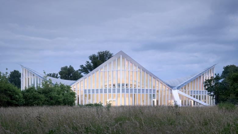 Konstruktiv und gestalterisch knüpfen die hinzugefügten Einbauten an die ursprünglich industriell geprägte, vertikal betonte Außenfassade aus Stahl und Glas an. Die neue transparente Glasfassade ermöglicht den Blick zum und vom Rotehornpark – dem im Zentrum Magdeburgs gelegenen Stadtpark – und ersetzt die bisherige transluzente Industrieverglasung, wobei die originale Fassadengliederung erhalten wurde.