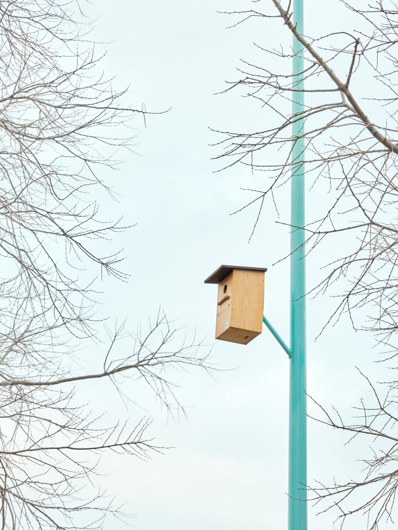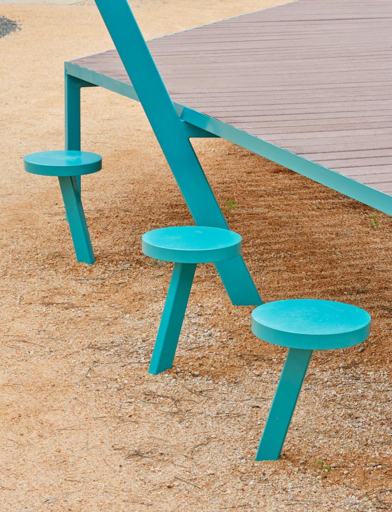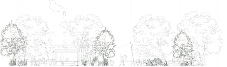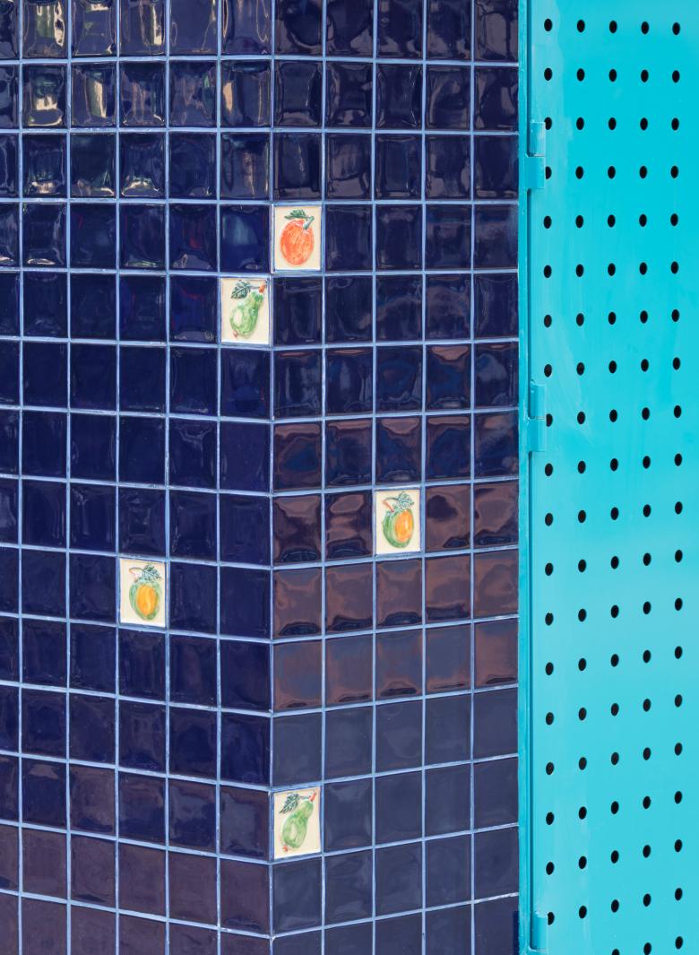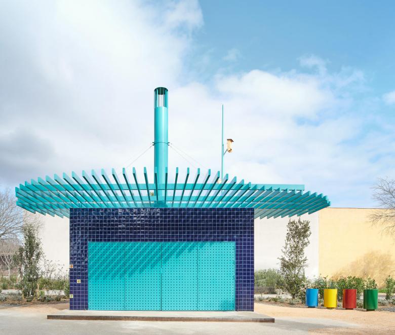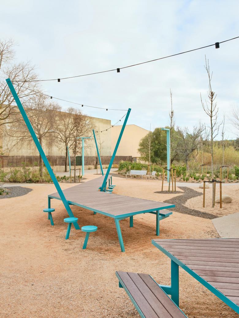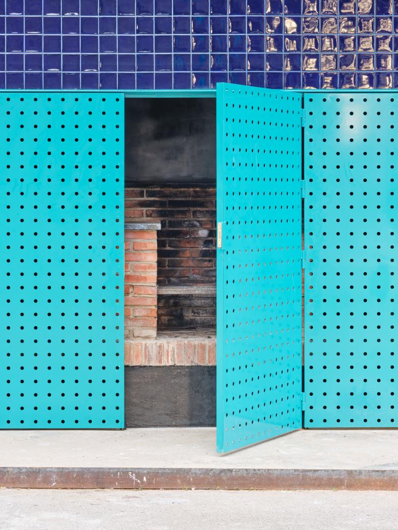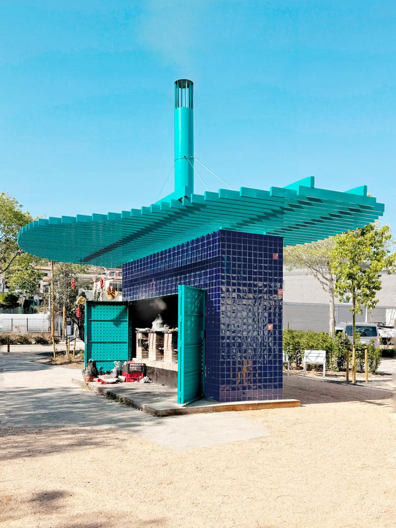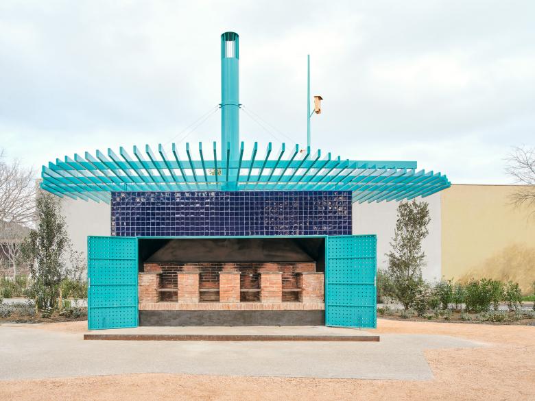 La intervención reinterpreta la barbacoa como el corazón del espacio, re-naturalizando el área con árboles y plantas aromáticas mediterráneas. Revestida con azulejos azules tradicionales de La Bisbal, protegida por una nueva pérgola y coronada por una chimenea simbólica que eleva el humo por encima de las copas de los árboles, la estructura se convierte en un hito visual y social.