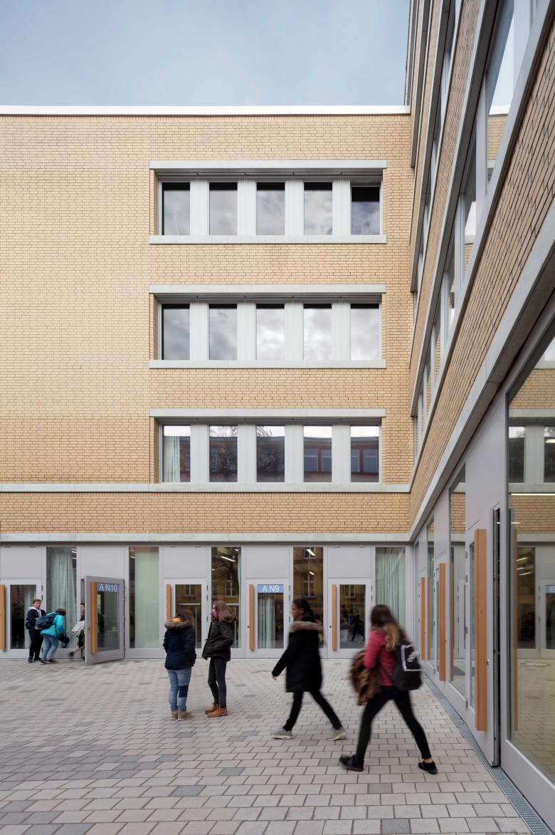 Eine offene Treppe mit Aufzug verbindet die verschiedenen Niveaus der Geschosse des Altbaus mit denen des Neubaus im Sinne der erwünschten Inklusion. In den Unterrichtsclustern weiten sich Verkehrsflächen zu flexibel nutzbaren Bereichen. Altbauflure öffnen sich im Neubau zur innenliegenden Schulterrasse mit Baum, dem gemeinsamen Raum mit Identifikation stiftender Intimität. Die Organisation des Schulhauses ist von dieser Idee bestimmt.