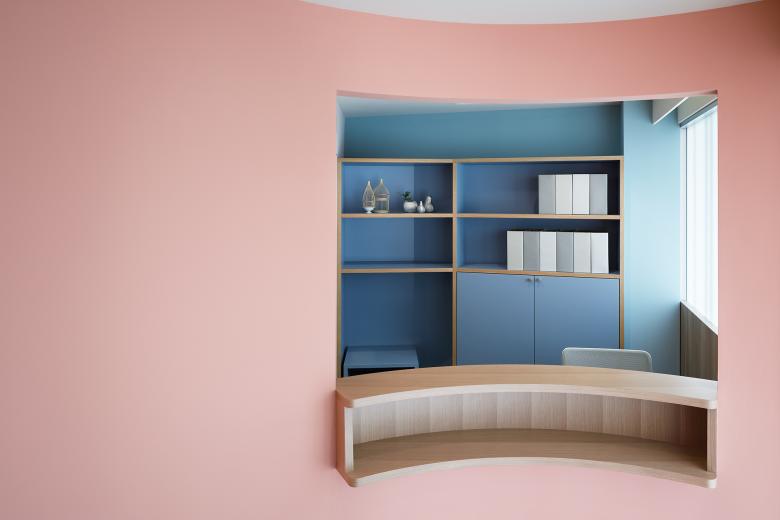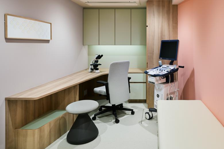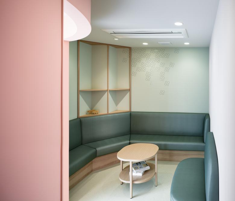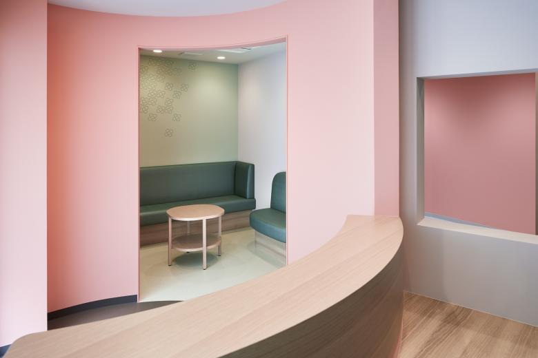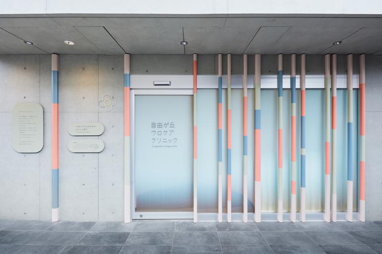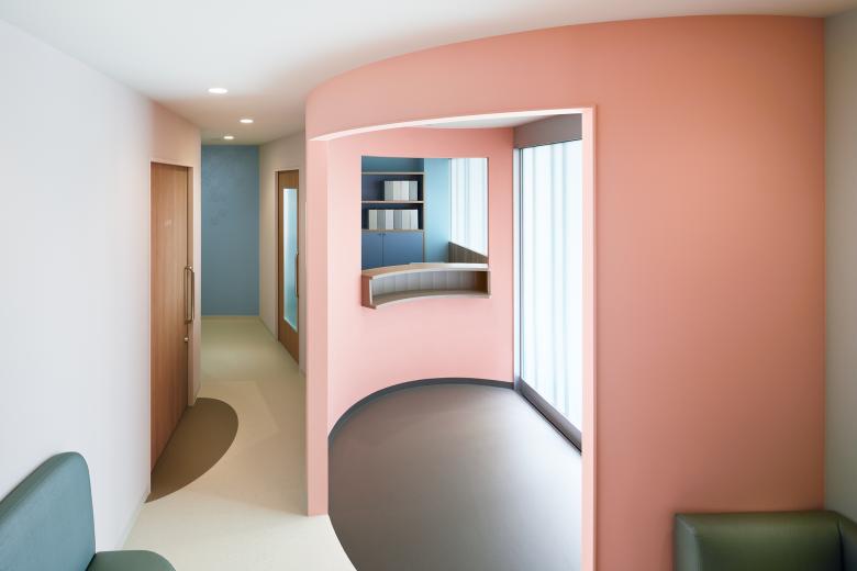 Urology for women and children. The goal is to change the image of urology, which is a challenging and difficult hospital to visit, and to make it as easy to drop in as if it were a café or salon. The facade with colorful columns randomly arranged, and the bright and calm pink color tone of the hospital, with curves everywhere, create a sense of safety that envelops the patient.