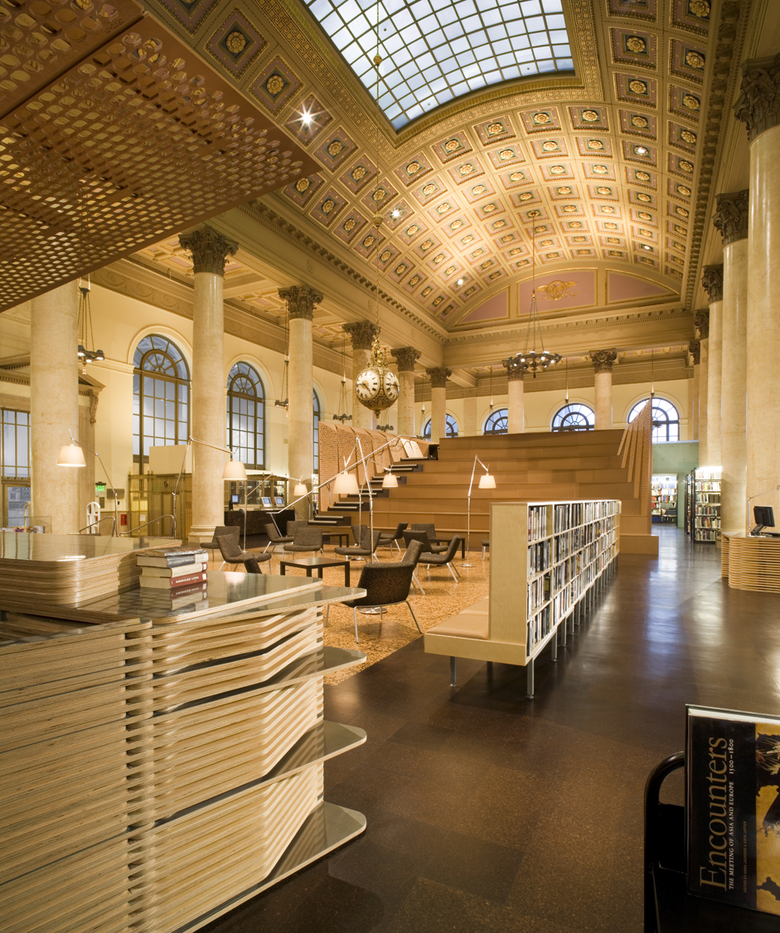 The RISD library houses an extensive collection of art and design volumes, magazines, and multimedia resources. In addition to the vast collection, group study areas, classrooms, a cafe, and administrative offices are included in the program. Organizing the library stacks and infrastructure within the confined space of the lobby, mezzanine, and second floor of a historically preserved bank building presented a great challenge. To overcome the limited floor area, two new pavilions housing key programmatic components were positioned within the void of the barrel vault of the main hall. The inserted objects not only house elements such as the check-out desk and reference book stacks, but make use of every surface to maximize their functionality. For example, one of the pavilions offers seating on a surface as it steps up to a study area that occupies the object’s roof and which, in turn, connects to the existing mezzanine.
