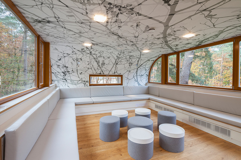 Auf einer Waldlichtung integriert sich das sanft geschwunge Baumhaus in die Kiefernwipfel und strahlt doch heraus. Konzipiert als besonderer Ort, an dem sich die Partner des Projektes und externe Gruppen zusammenfinden um über Umweltschutzfragen zu beraten, teilt es sich im Wesentlichen in zwei Baukörper. Während in einem Teil des Hauses eine Café-Lounge mit Kleinküche, der Sanitärbereich und ein Technikraum untergebracht sind, befindet sich im weiter oben angeordneten Gebäudeteil das Herzstück, ein exquisiter Konferenzraum. Passend zu den grünen Inhalten des Projekts ist das Baumhaus mit nachhaltiger Beleuchtungstechnik mit durchgängiger Optik ausgestattet: Auch die Nimbus Modul Q LED-Leuchten, die sowohl im Innen- als auch im Außenraum zum Einsatz kamen, ergänzen das Projekt perfekt. „Die Leuchten sind formschön, wertig und verfügen über eine gute LED-Technik.“ konstatiert Architekt Andreas Wenning, der für die Architektur des Baumhauses verantwortlich zeichnet.