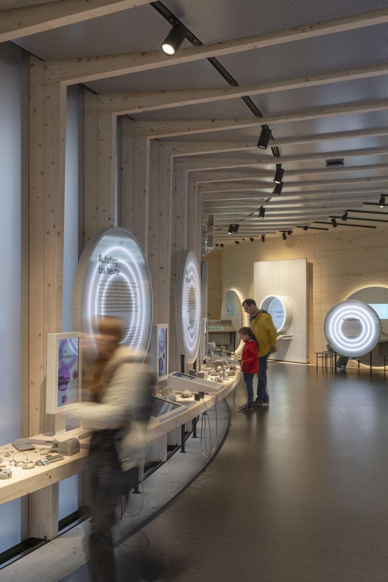Auf der platzabgewandten Seite wird der Grundriss durch vier kleinere Kreissegmente bestimmt, welche die Kronen der umstehenden Bäume aufgreifen. Im Innern formen sie Themeninseln mit interaktiven Exponaten, die auf einzelne Aspekte des Phänomens Künstliche Intelligenz vertieft eingehen. Zwischen den Themeninseln weitet sich der Raum und schafft Platz für ein zentrales Exponat. In der Verlängerung dieses Bereichs bilden die Wände eine trichterartige Öffnung, die mit einem Panoramafenster den Blick auf den Neckarkanal lenkt.