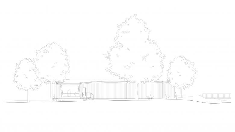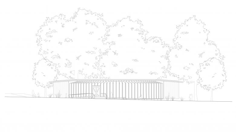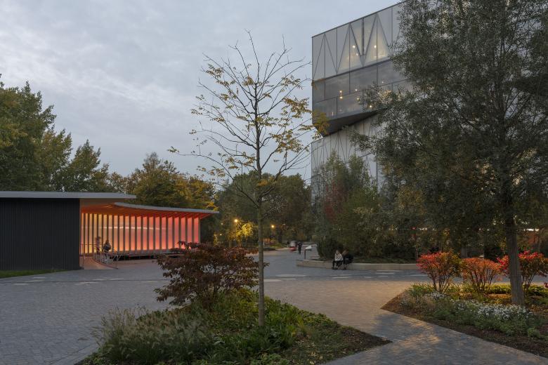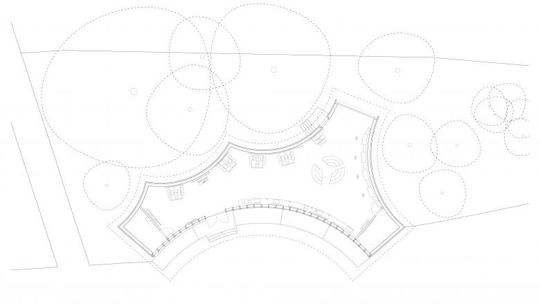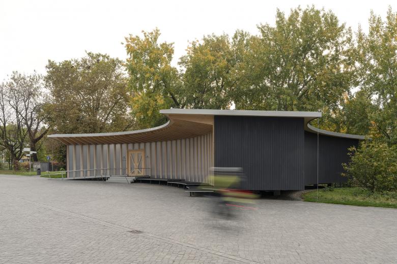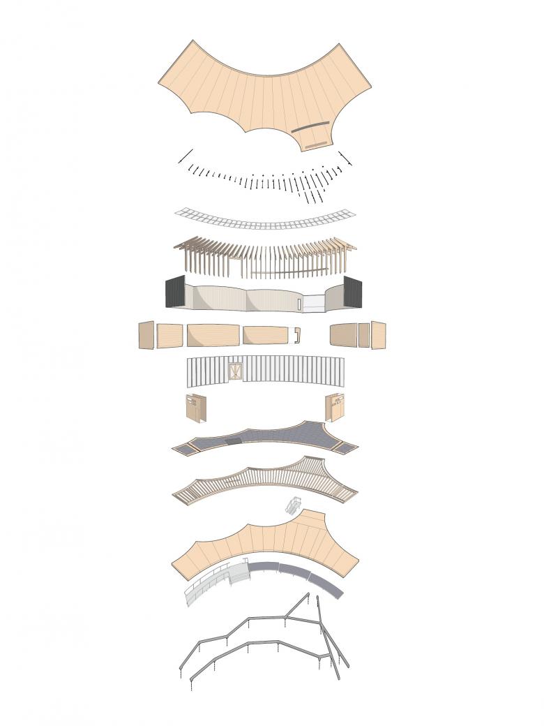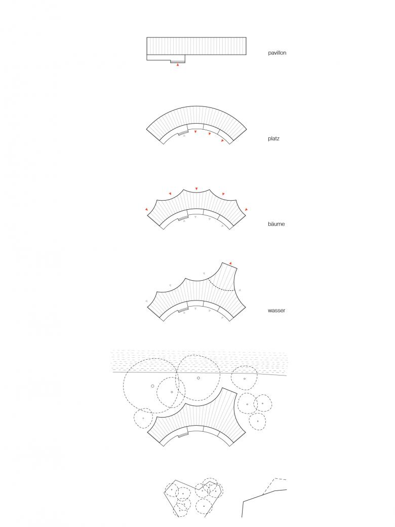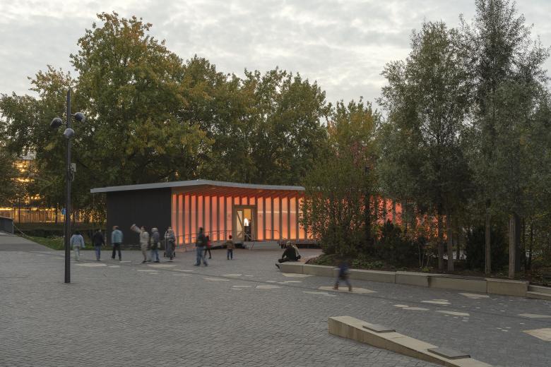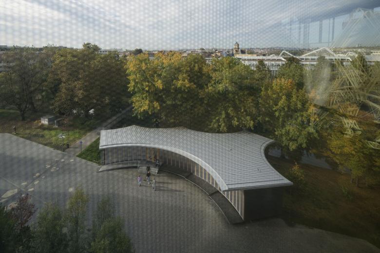 Während der Experimenta-Platz durch die beiden Ausstellungsgebäude und das Neckarufer bereits klar eingefasst war, findet er nun in der geschwungenen Fassade des KI Pavillons auch nach Westen hin einen Abschluss. Mit seinem leichten Vordach wirkt das Gebäude wie eine Art moderne ‚Stoa‘ auf dem ‚Wissens-Forum‘. Abgestufte Podeste laden als Sitzgelegenheit und Podien zum Verweilen oder Diskutieren ein und gleichen zudem das Gefälle des Geländes aus. Damit ist der temporäre Pavillon auch Teil einer dauerhaften Umgestaltung des Freiraumkonzepts durch UNIOLA und von K Landschaftsarchitektur, die eine großflächige Entsiegelung der Platzfläche vorsieht: Vorhandene Baum- und Sitzinseln werden in eine zusammenhängenden Grünfläche integriert, zusätzliche grüne Inseln dienen als Experimentierfelder für eine klimagerechte Bepflanzung.