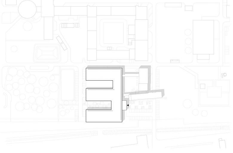 In Lage und Ausrichtung wird danach getrachtet, den Hauptzugang so zentral wie möglich in Bezug auf den gesamten Campus zu legen und gleichzeitig eine leichte Erweiterbarkeit Richtung Süden zu gewährleisten. In diesem Sinne wird das Gebäude von der Industriestraße im Norden via Haupteingang erschlossen. Seitlich neben dem Hauptzugang sind Besucherparkplätze angeordnet. Vom Hauptzugang ausgehend erstreckt sich nach Süden das Haupterschließungsrückgrat, das alle Trakte sowie das bestehende Kopfgebäude (CI) miteinander verbindet und in der zweiten Phase weiter Richtung Süden verlängert werden. Damit wird die Integration der zweiten Ausbauphase bereits in der ersten Bauphase mitgedacht, als logische Weiterführung des Grundsystems.