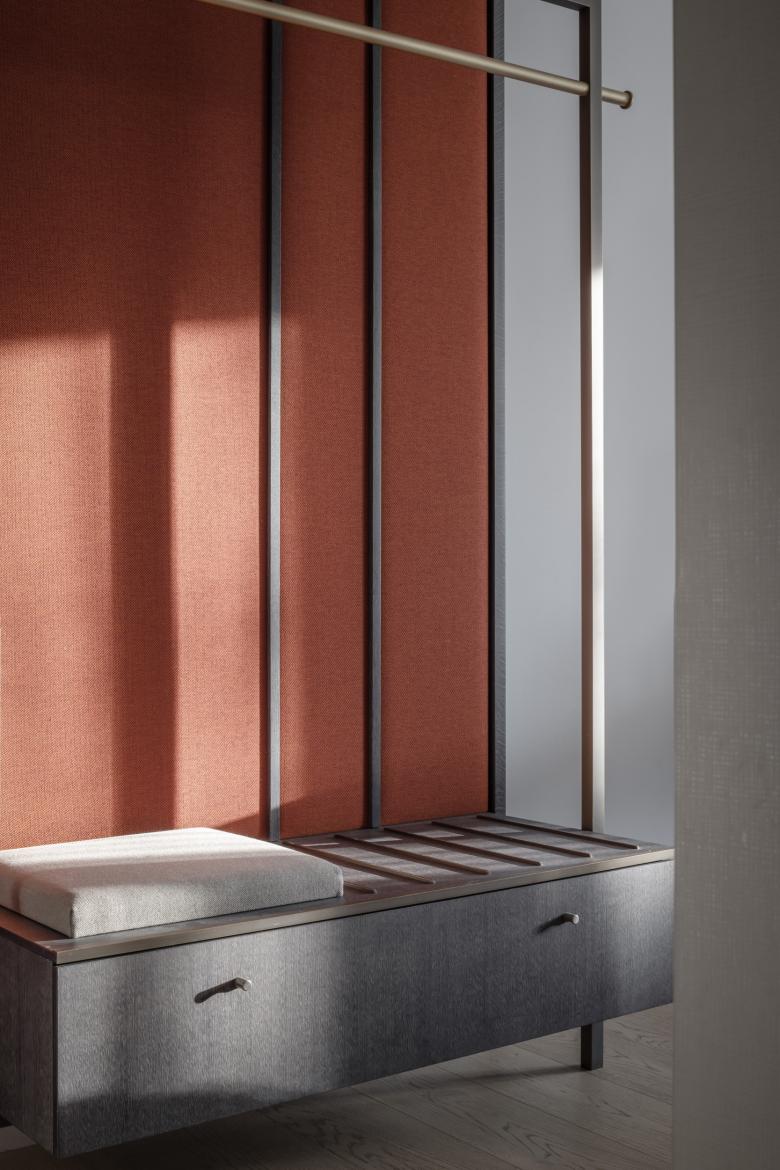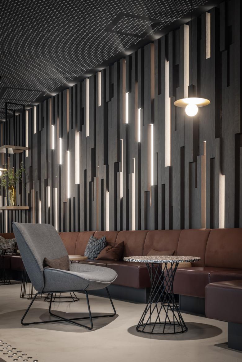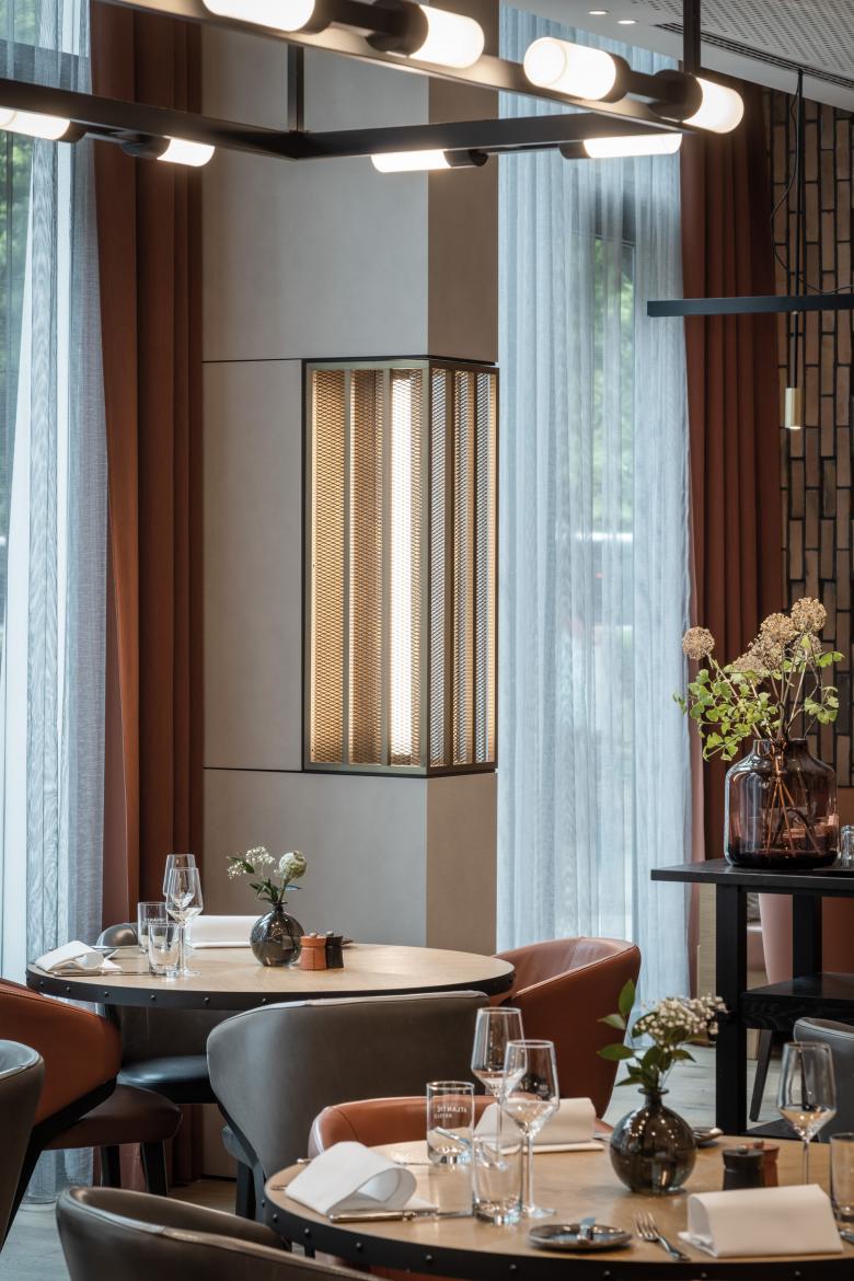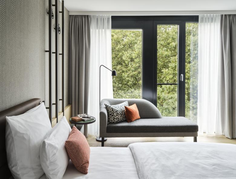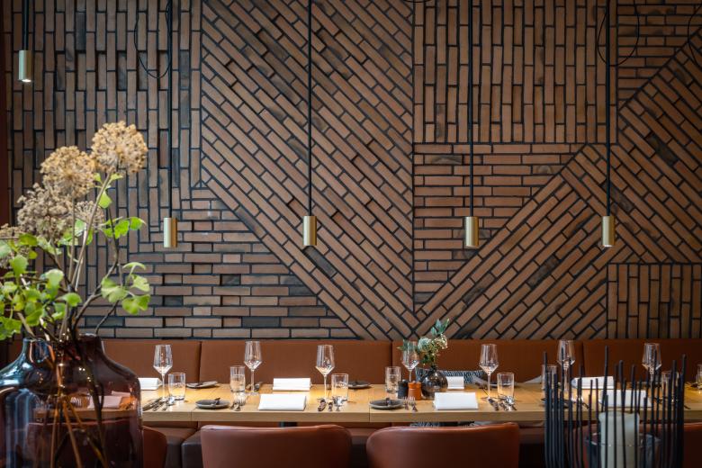 Der Innenausbau ist geprägt von vielen Sonderanfertigungen, vom Grill, über Tresen, Wand- und Deckenelemente bis hin zu Sitzbänken. Hochwertige, natürliche Materialien wie Holz, Stein und Textilien stehen in Kontrast zu industriellen Materialien wie Sichtbeton oder Messing. Eine Wandverkleidung aus Backsteinriemchen im Restaurant spielt auf die historischen Gebäude in Münster an. Bei der Farbgebung haben wir uns von der jahreszeitlichen Verfärbung der Natur inspirieren lassen, die man vom Hotel aus sehen kann. So gibt es Bereiche in frischem Grün als Metapher für Frühling und Sommer sowie in Gelb und Rotbraun für Herbst und Winter. Die Hotelzimmer präsentieren sich stofflich, leicht und modern in der Ausstrahlung.