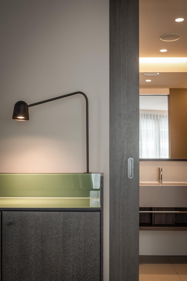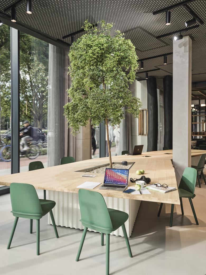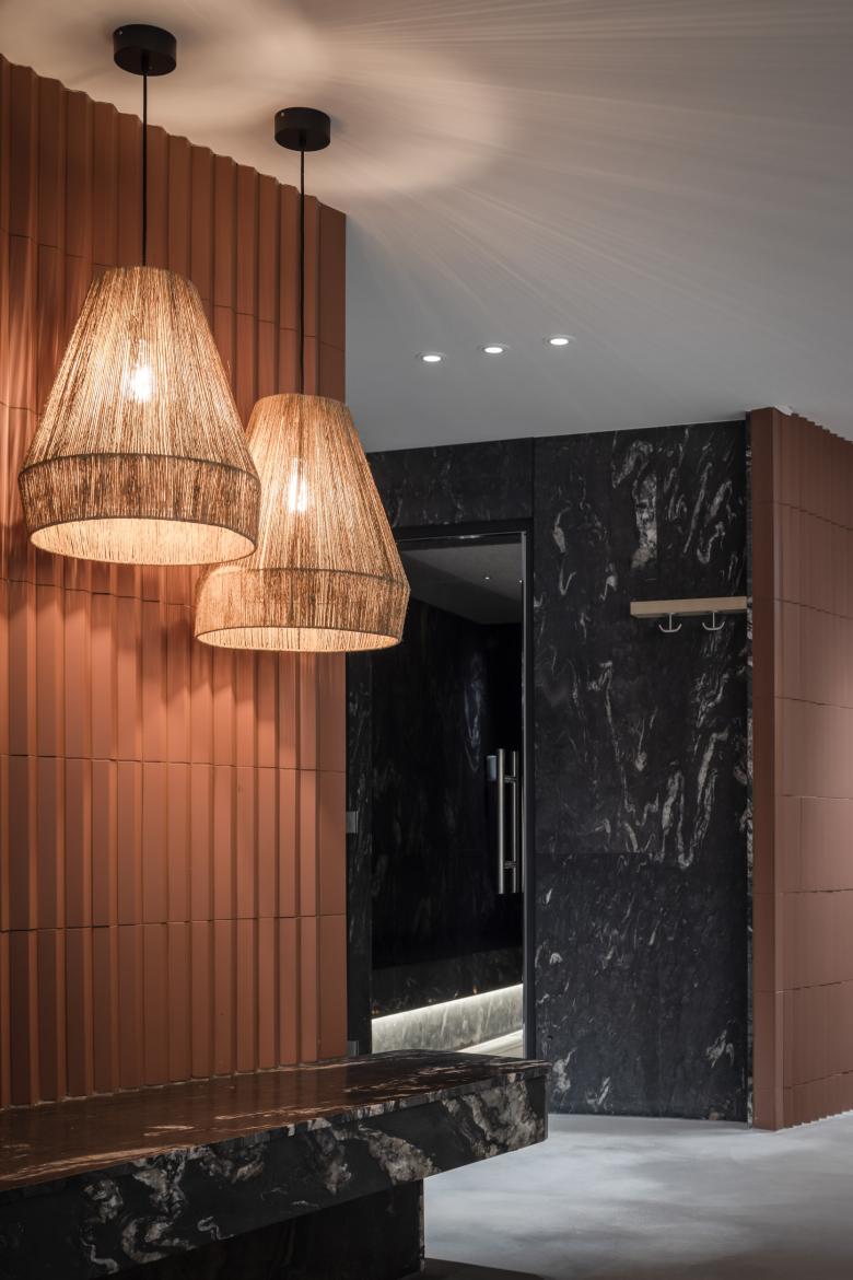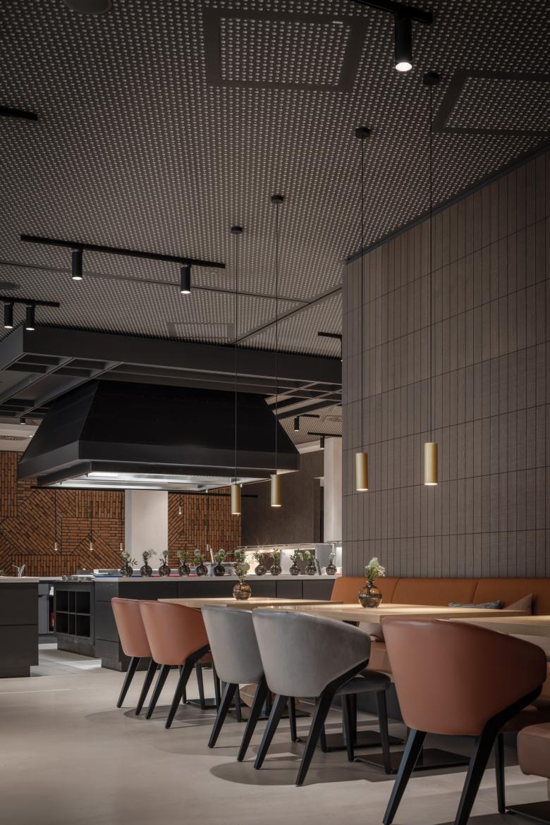 Der Innenausbau ist geprägt von vielen Sonderanfertigungen, vom Grill, über Tresen, Wand- und Deckenelemente bis hin zu Sitzbänken. Hochwertige, natürliche Materialien wie Holz, Stein und Textilien stehen in Kontrast zu industriellen Materialien wie Sichtbeton oder Messing. Eine Wandverkleidung aus Backsteinriemchen im Restaurant spielt auf die historischen Gebäude in Münster an. Bei der Farbgebung haben wir uns von der jahreszeitlichen Verfärbung der Natur inspirieren lassen, die man vom Hotel aus sehen kann. So gibt es Bereiche in frischem Grün als Metapher für Frühling und Sommer sowie in Gelb und Rotbraun für Herbst und Winter. Die Hotelzimmer präsentieren sich stofflich, leicht und modern in der Ausstrahlung.