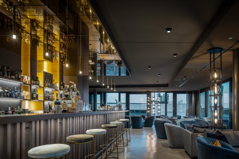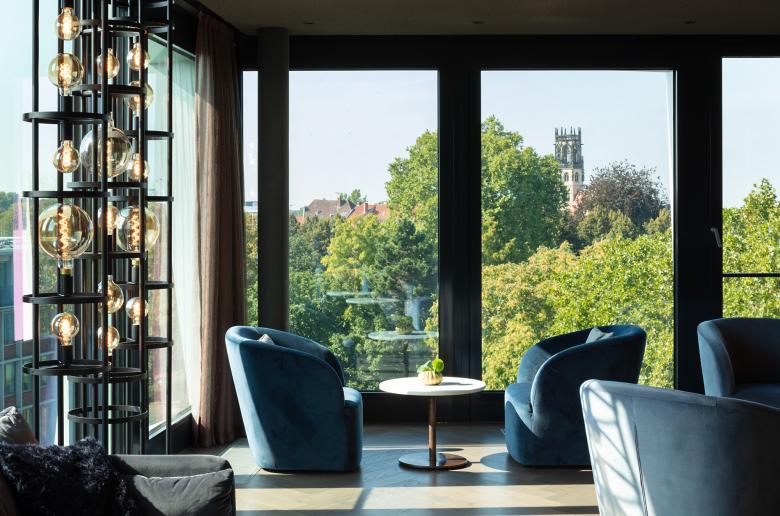 Schmuckstücke sind der Engelsaal auf der achten Etage mit beidseitigem Blick auf Münster und die Skybar, die allen offen steht. Während sich der Engelsaal funktional gibt, setzt die Skybar auf Glamour: Mit samtbezogenen Clubsesseln in Petrolblau, dunkel gebeizten Holzverkleidungen und goldenen Akzenten.
