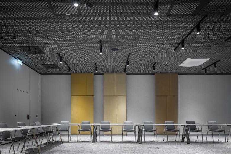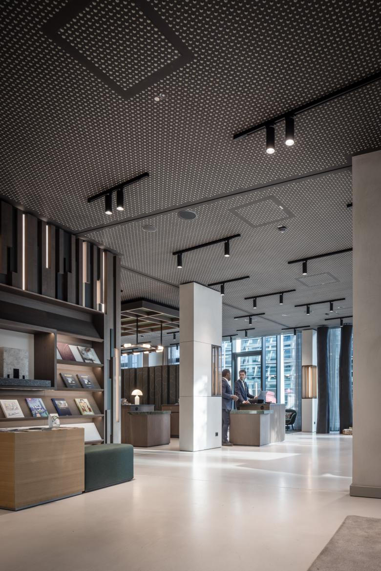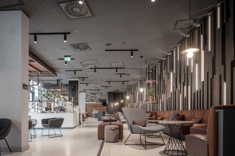 Für das 4-Sterne-Hotel mit 224 Zimmern, mehreren Konferenzbereichen sowie mit Restaurant und Skybar haben wir ein zeitgenössisches, kosmopolitisches Interior Design umgesetzt, das immer wieder regionale Zitate aufgreift. Das Hotel soll nicht nur Gäste willkommen heißen, sondern auch Münsteraner*innen. So wurde das Erdgeschoss offen und einladend gestaltet, mit einer Zeitschriftenauslage, verschiedenen Sitzmöglichkeiten und einem Daily, an dem man sich schnell einen Kaffee oder einen Mittagssnack holen kann. Die Rezeption tritt dabei in den Hintergrund, sodass man nicht sofort das Gefühl hat, ein Hotel zu betreten. Das Restaurant im hinteren Bereich wartet mit einem offenen Grill in der Mitte auf, der zum Frühstücksbuffet umgewandelt werden kann. Die verschiedenen Zonen sind offen gestaltet und fließen ineinander über. Durch die vollständige Verglasung des Erdgeschosses entsteht ein scheinbar nahtloser Übergang zwischen innen und außen, der das Innenleben mit der Stadt verbindet.