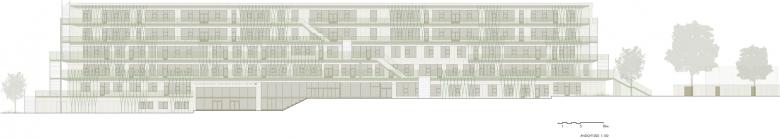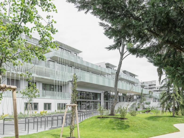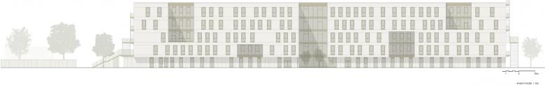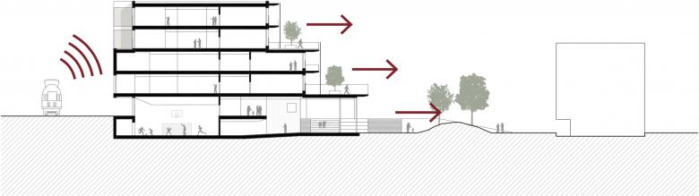 Das Gebäude steht in einem besonderen Dialog mit dem Kontext: Im Norden liegt ein Bahndamm, im Süden gibt es viel Grün. Das inspirierte die Architekten dazu, das Gebäude terrassenförmig mit Blick ins Grüne nach Süden hin auszurichten – mit Balkonen und Terrassen wie die hängenden Gärten von Semiramis. Passend zur Topografie fiel die Entscheidung auf einen zweigeschossigen Eingang. Von Osten und Westen gelangen Schüler und Lehrer auf zwei unterschiedlichen Niveaus ins Gebäude. Die Nordfassade erhält durch Einschnitte ihren dreidimensionalen, mäanderartigen Charakter.