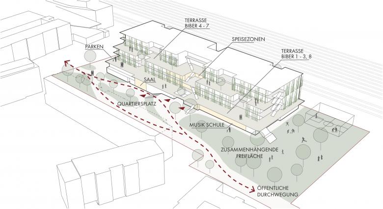 Neben der Anpassung an die Umgebung musste das Gebäude auch den Platz für 12 Kindergartengruppen, zwei Ganztagsschulen (Volksschule und Mittelschule) mit insgesamt 29 Klassen, Räume für Sonderpädagogik, eine Musikschule sowie drei Turnsäle und eine großzügige Freifläche bereitstellen. Eine intelligente Anordnung mit einfachen Verbindungen sollte klare Strukturen mit Wohflühlfaktor schaffen. Das Zentrum bildet eine Ebene, die mit Speisesälen und Kreativbereichen die Kommunikation fördert. Insgesamt gibt es zwei Hauptzugänge, die über einen Luftraum miteinander verbunden sind. Von diesem Foyer aus erschließen zwei klare, gut auffindbare Treppenhauskerne das Campusgebäude vertikal. Diese Kerne sind immer unmittelbar an die Bildungsbereiche, an sonstige Kreativräume oder die Speisesäle angeschlossen. Im Inneren sind alle Räumlichkeiten auf kurzem und einfachem Wege erreichbar.
