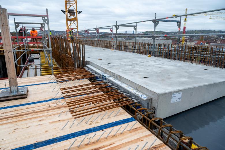 Das „Bildungshaus NeckarPark“ in Bad Cannstatt ist eines der größten und innovativsten Schulbauprojekte der Landeshauptstadt Stuttgart. Es vereint vier Nutzungen für lebenslanges Lernen und ist zugleich das erste öffentliche Gebäude der Gebäudeklasse 5 in Holzbetonverbundbauweise in Stuttgart. Umlaufende Fluchtbalkone über alle Geschosse, an die eine Fassadenbegrünung mit Pflanztrögen angeschlossen ist, verleihen dem Bildungshaus sein markantes Äußeres. Die sichere Befestigung und zuverlässige Lastabtragung der auskragenden Stahlbetonfertigteile an die Holzkonstruktion konnte mit Schöck Isokorb sichergestellt werden.