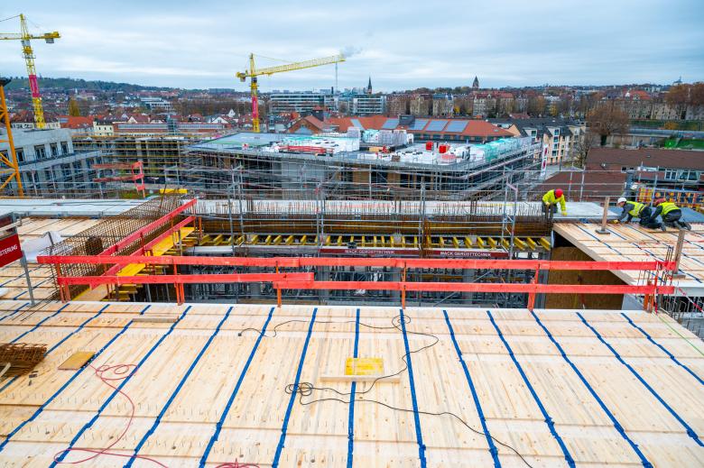 Die Geschossdecken wurden als Holz-Beton-Verbunddecken einachsig mit einer Stützweite von 7,50 Meter ausgeführt und liegen im Fassadenbereich auf Holzträgern aus Bau-Buche auf. Die Holzträger werden durch Holzstützen im Raster von 2,40 Meter abgefangen. Die Brettschichtholzelemente für die Decke haben eine Dicke von 20 Zentimeter, die darüber durch Kerven und Verschraubungen im Holz schubfest verbundene Ortbetonschicht eine Dicke von 10 Zentimeter.