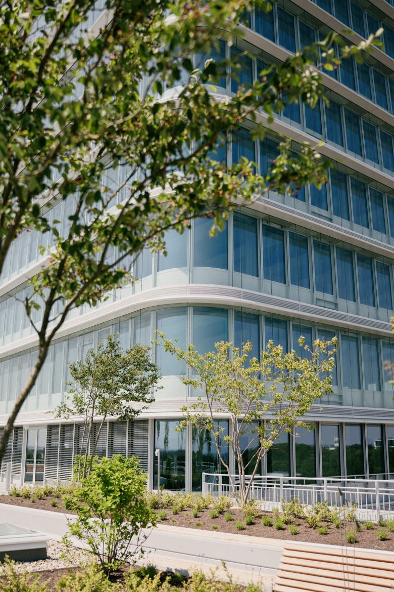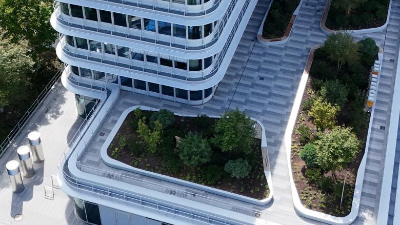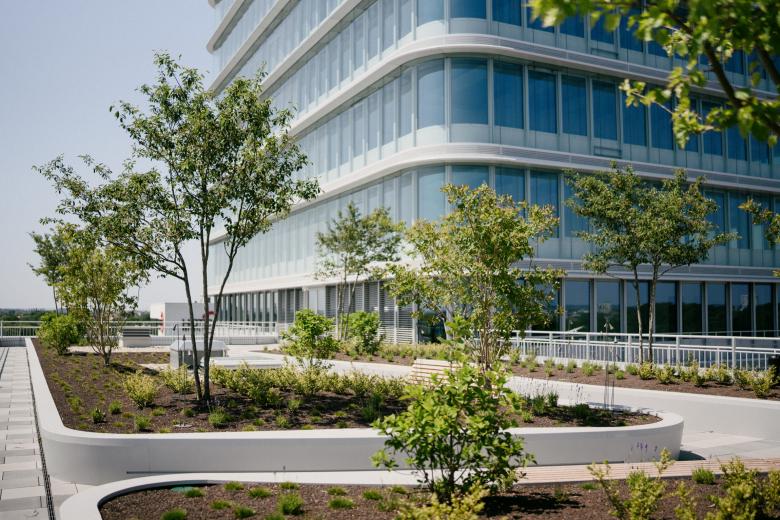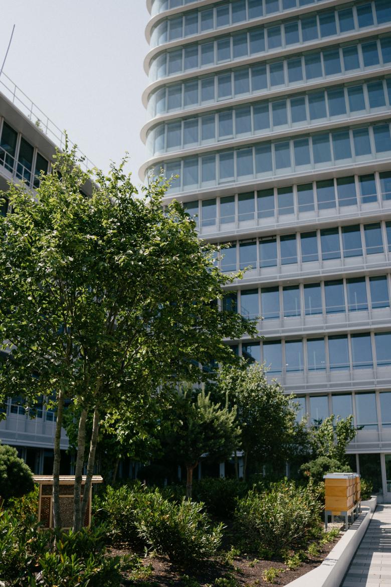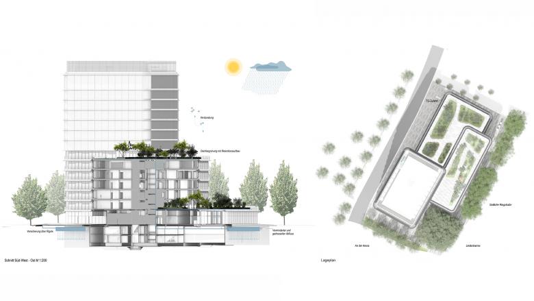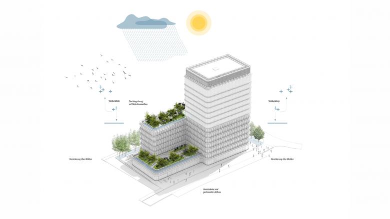 Die Dachflächen des 1. und 6. Obergeschosses werden als intensivbegrünte Retentionsdächer mit Aufenthaltsmöglichkeiten ausgebaut. Ein multifunktionaler Begrünungsaufbau mit hoher Wasserspeicherung inkl. Anstaubewässerungsebene wurde vorgesehen. Die Integration der bankeigenen Bienenvölker und von Bienenhotels ist ein Beitrag zur Stärkung der Biodiversität und Nachhaltigkeit.
