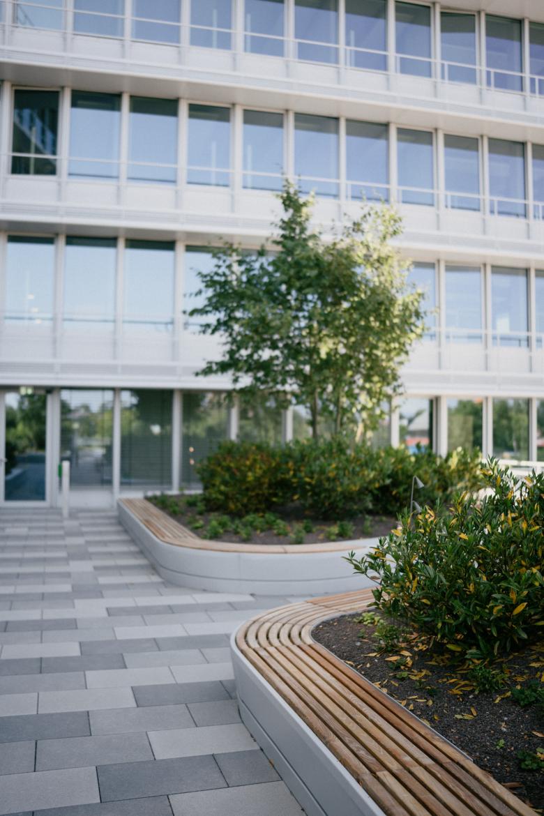 Das Freiraumkonzept leistet einen wichtigen Beitrag zu einer repräsentativen Adressbildung und zur Attraktivität der neuen Unternehmenszentrale der Volksbank Raiffeisenbank Bayern Mitte eG. Die Freiräume bieten den Beschäftigten und Besuchern hochwertige und differenzierte Aufenthalts- und Erholungsflächen sowohl auf Erdgeschossebene als auch auf den intensiv gestalteten Dachflächen.