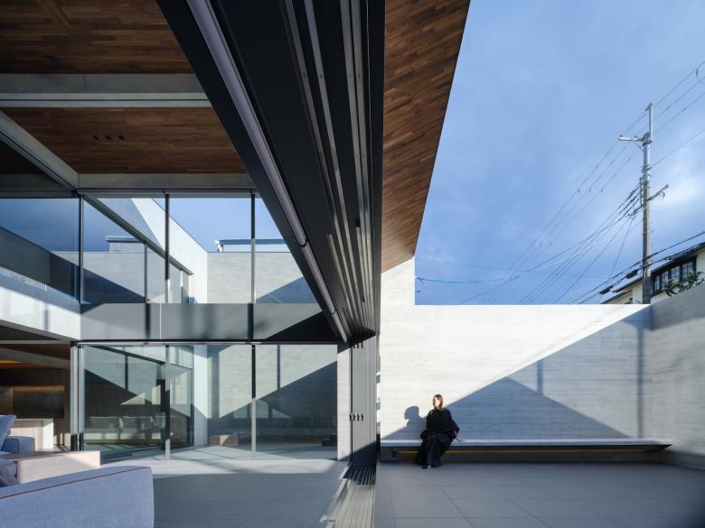 敷地は京都南部の閑静な住宅地。2方向の道路に面したL型の敷地には高低差があり南北に異なるファサードが存在します。