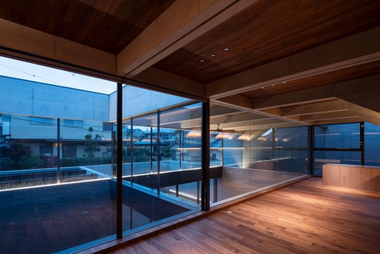 在宅勤務を可能にする2階のワークプレイスには執務やミーティングエリアの他に、フィットネス設備も完備。リビング吹抜けから見上げるとガラス越しに仕事の気配やボディケアのアクティビティを感じることが出来ます。