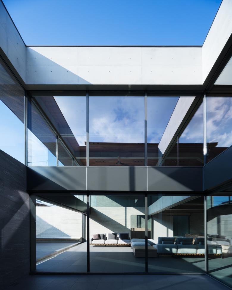 吹抜けのファミリーリビングには大小3つの中庭を設えました。玄関先のエントランスコートに加え、キッチンの奥まで自然光を呼び込むダイニングキッチンエリアの中庭やフルオープンサッシを設えたベンチ付きのセンターコートなど、いずれも異なる特徴を持つ庭の存在が、空間の中での役割を果たしています。