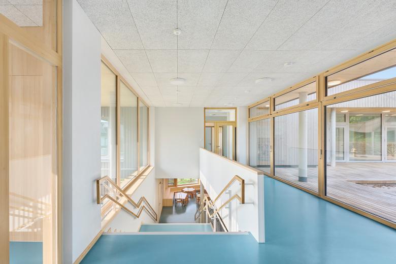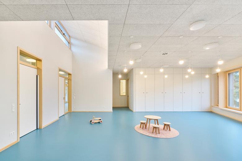 Im Gebäude setzen warme Holztöne, weiße Oberflächen, helle Wände und Decken sowie klare Sichtbetonflächen Akzente und schaffen eine freundliche Lern- und Spielumgebung. Das markante Türkis des robusten Kautschukbodens zieht sich als lebendiger Farbton durch das gesamte Gebäude und schließt auch die Treppenanlage ein. Die einzelnen Materialien fügen sich harmonisch zu einem stimmigen Materialkonzept zusammen und vermitteln einen schlichten und zurückhaltenden Gesamteindruck, den die Kinder lebendig und bunt bespielen. Akustikdeckenplatten aus Holzwolle dämpfen den Schall und schaffen eine angenehme Raumakustik. Ein durchdachtes Lichtkonzept kombiniert Pendel- und Scheibenleuchten mit individuell steuerbaren Lichtbändern, die verschiedene Beleuchtungsszenarien ermöglichen.