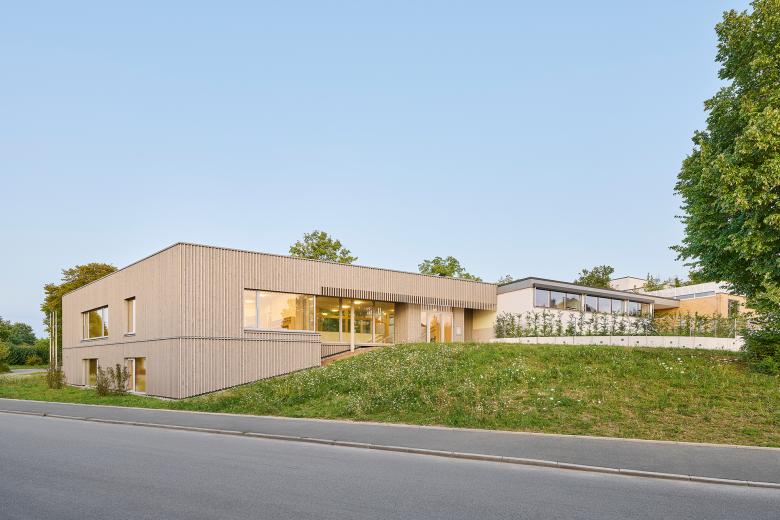 Die Bestandsgebäude, zwei kubische Baukörper aus gelblichem Stein und einem weiß gestrichenen Mittelteil aus den 1950er-Jahren, wurden bei laufendem Kita-Betrieb in Teilen saniert und umgebaut. Gemeinsam mit dem Neubau bilden sie einen geschützten Innenhof, der als abgeschirmter und sicherer Spielplatz für die U3-Kinder dient. Der neue Erweiterungsbau hebt sich bewusst von der Bestandsarchitektur ab und überzeugt mit einer geschwungenen Fassade aus vertikalen, vorvergrauten Holzpaneelen. Diese Lamellenstruktur reflektiert die natürliche Hanglage und erzeugt je nach Blickwinkel eine veränderliche Fassadengestaltung. Sie dient nicht nur als gestalterisches Element, sondern den Kindern auch als dezente und zugleich wirkungsvolle Absturzsicherung der großzügigen Fensterflächen der Gruppenräume. Die insgesamt gestaffelte Gebäudehöhe bewahrt die bestehende Struktur der Kita-Anlage und fügt sich sanft in die Hanglage ein.