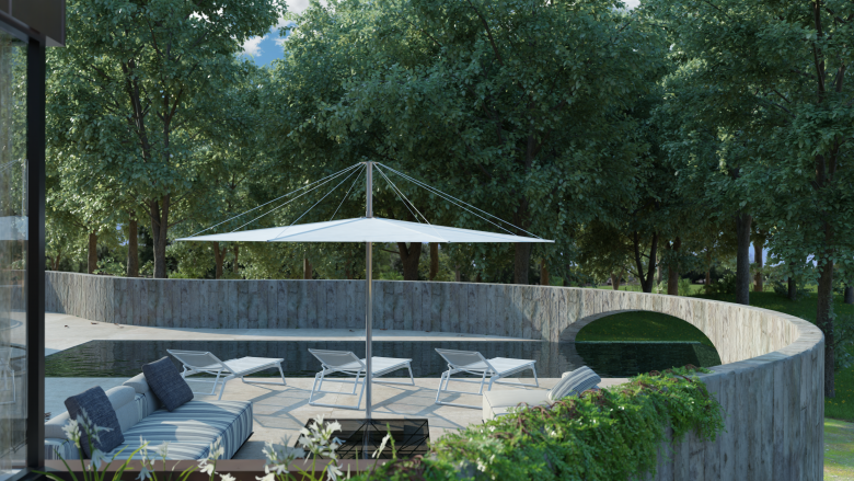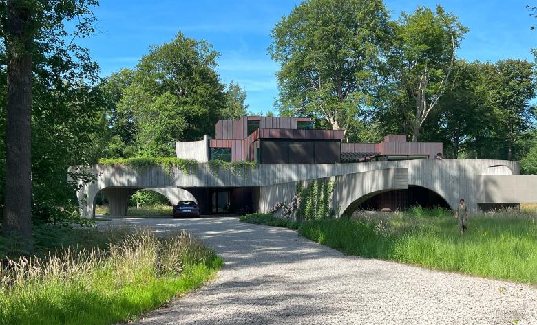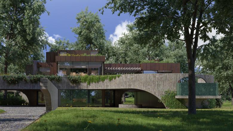 The design plays with contrasts: the geometric base shape of the house is refined by the organic curves of the floating terraces and hanging gardens. Materials such as patinated red copper and wood-structured concrete enhance this contrast, creating a harmonious blend of architecture with the natural environment.