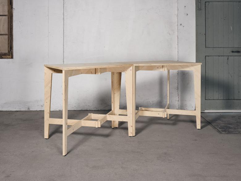 Tous les éléments constitutifs du mobilier sont découpés par CNC sur une planche de trois-pli en épicéa, reprenant de ce fait le matériau principal du bâtiment lui-même. Le fichier de découpe est pensé afin de minimiser les chutes tout en maximisant la rigidité structurelle des pièces. Le système d’assemblage en tenon-mortaises et queues droites permet un montage rapide sans colle ni vis, grâce à la précision de la découpe numérique.