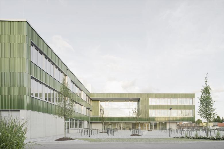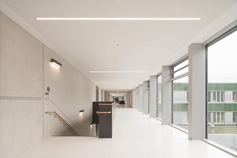 Eine in Grüntönen changierende, hochwertige Keramikfassade „veredelt“ den robusten Entwurf und verbindet den Neu-bau geschickt mit dem angrenzenden Landschaftsbiotop. Trotz der industriellen Fertigung ist ein attraktiver Ort zum Lernen und Leben und viel Raum für neue Lernformen entstanden.