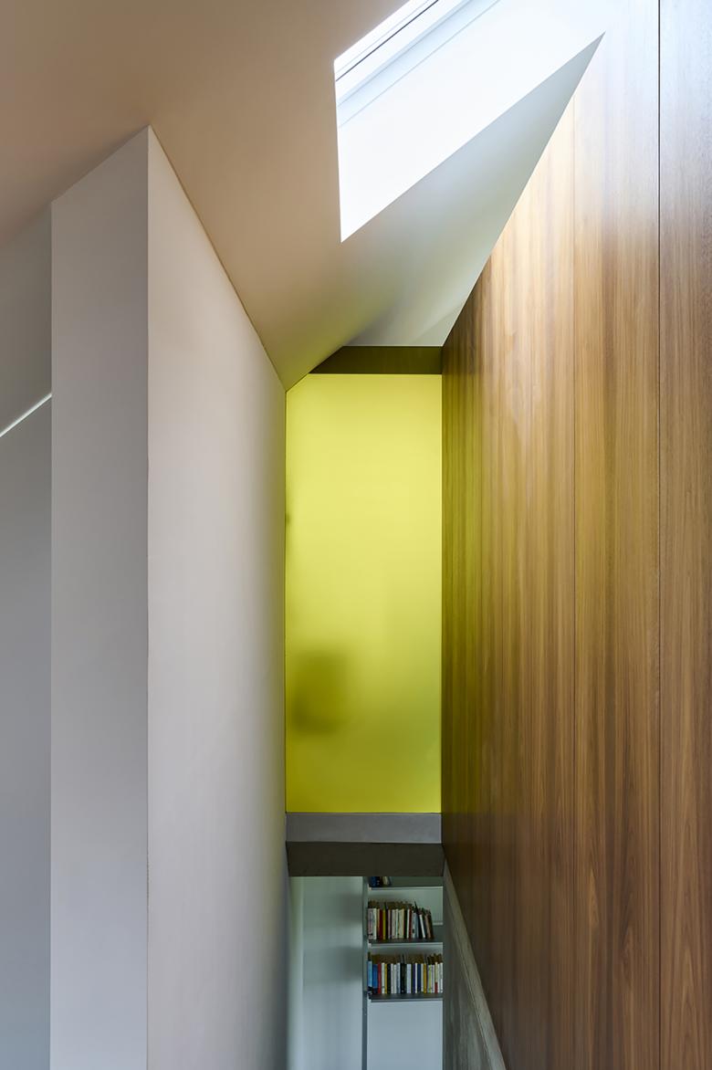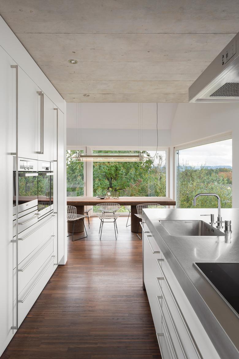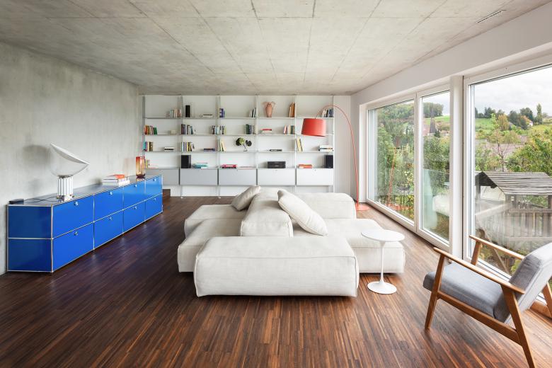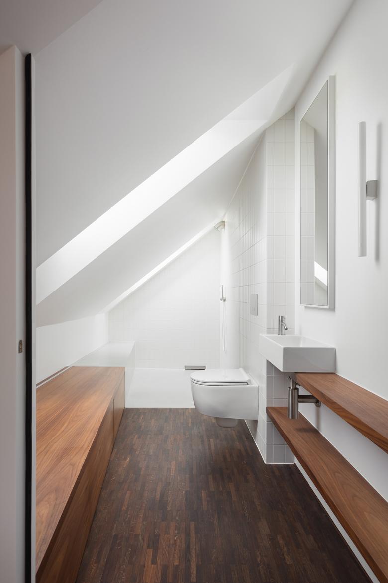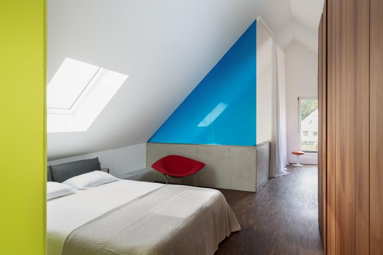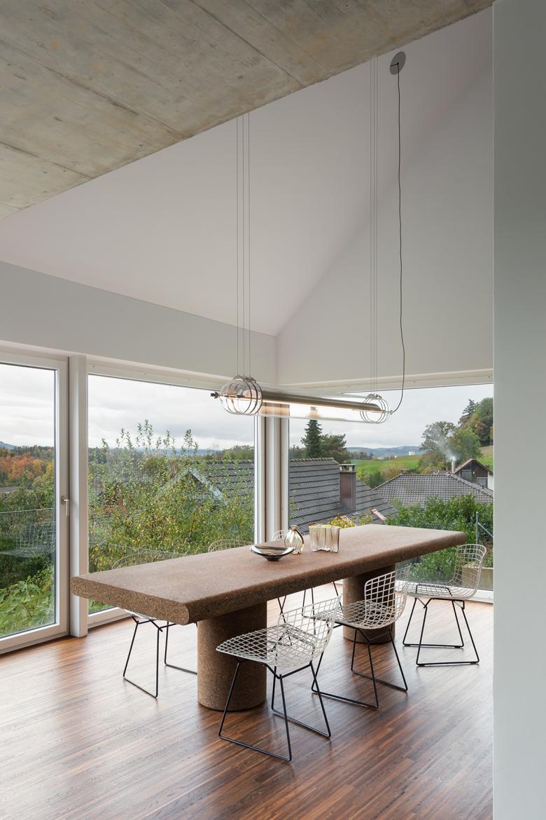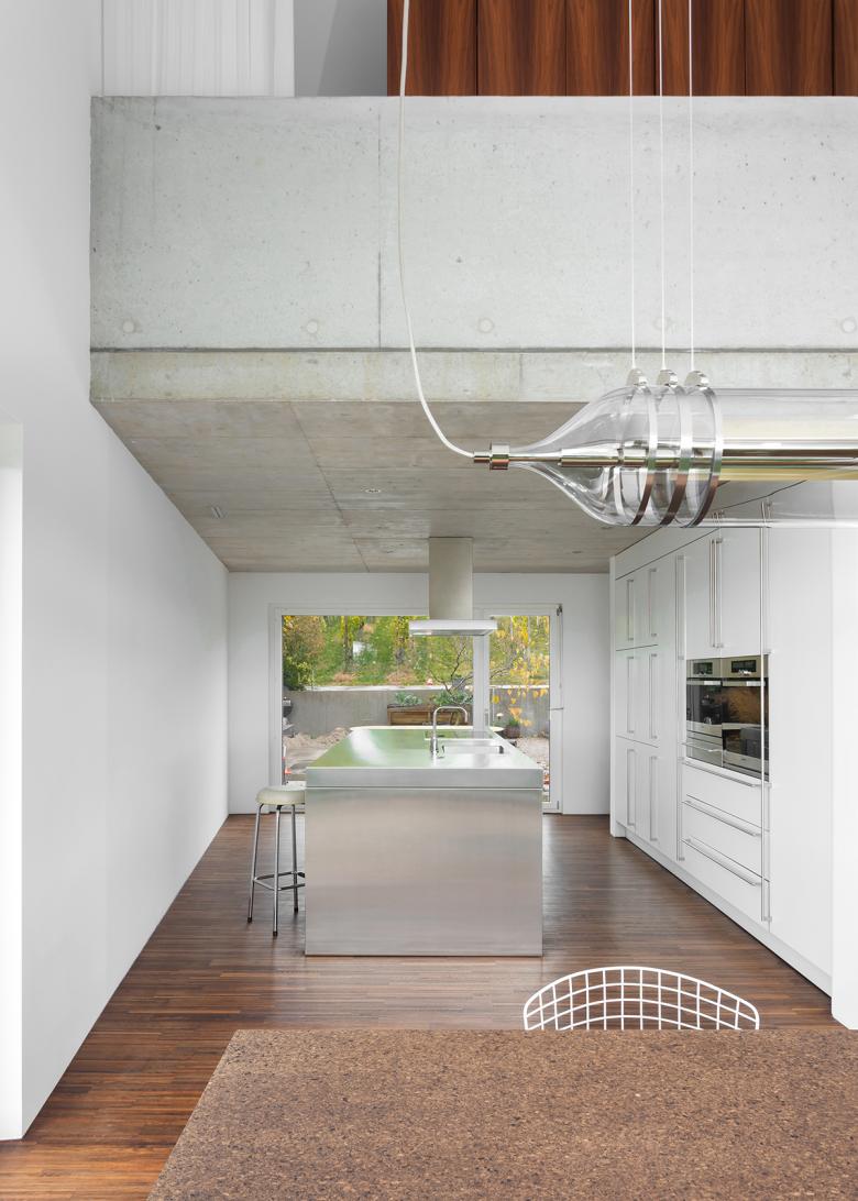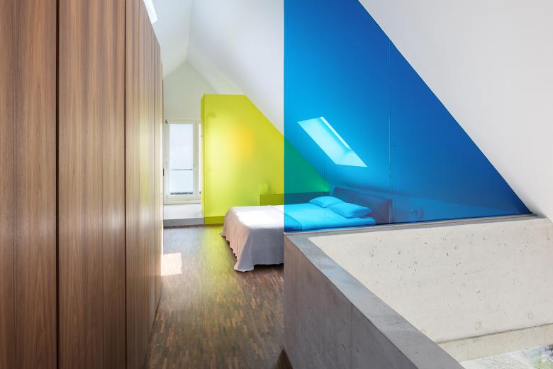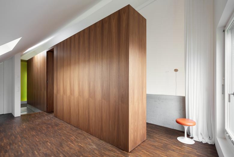 The renovation of a villa in Trüllikon, Zürich, Switzerland, aimed to preserve its original, asymmetrical open design while enhancing functionality and spatial flow. The attic, previously an open and unusable space due to its sloping roof, was transformed into a master bedroom and office/guest area. The basement was redesigned into a unique, dedicated space for the client's three children. The design challenge involved creating custom spaces within a complex existing layout. The solution integrated "micro-architectures," volumes, and surfaces into the open floor plan, creating distinct yet interconnected zones.