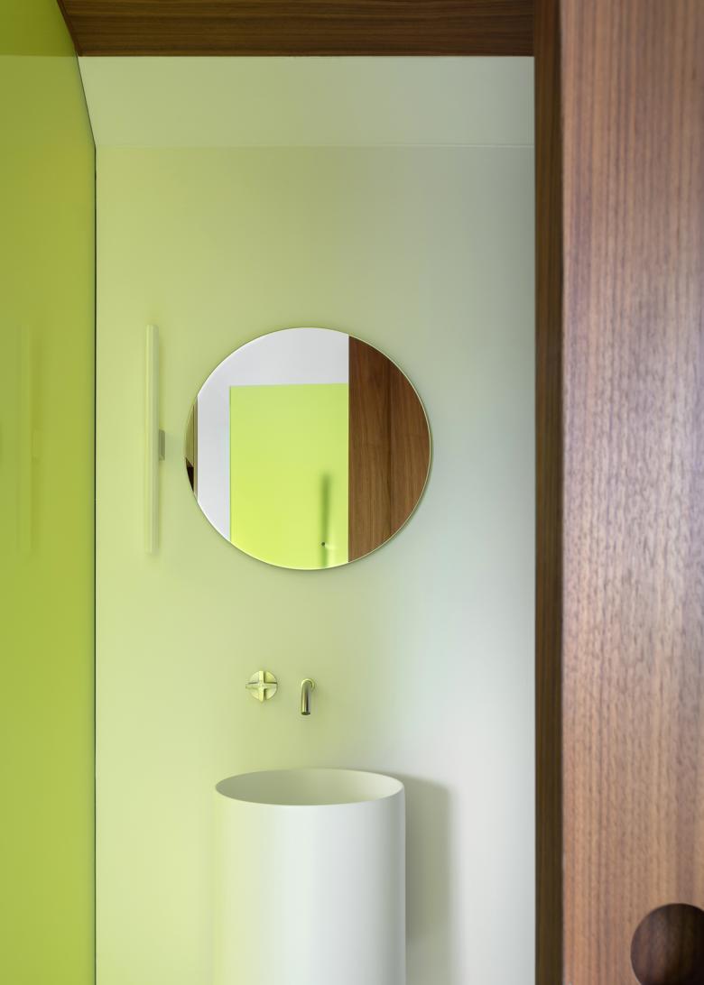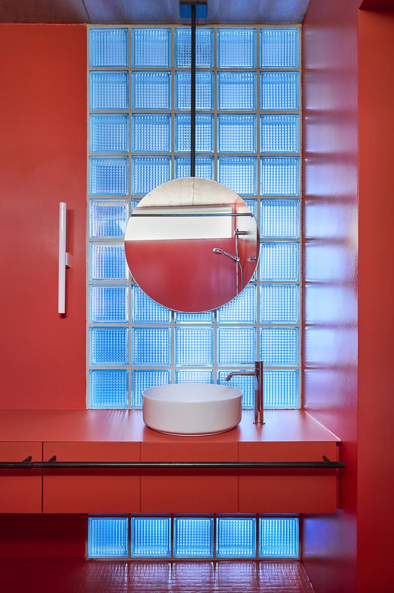 The design also emphasized a seamless relationship between the interior and the exterior. Inspired by the surrounding vineyards, the shower in the guest bathroom is integrated into the roof’s thickness, with a new opening allowing the outdoors to become part of the interior. The use of colored glass in yellow and blue adds dynamic elements, creating plays of light and color that transform the atmosphere throughout the day.